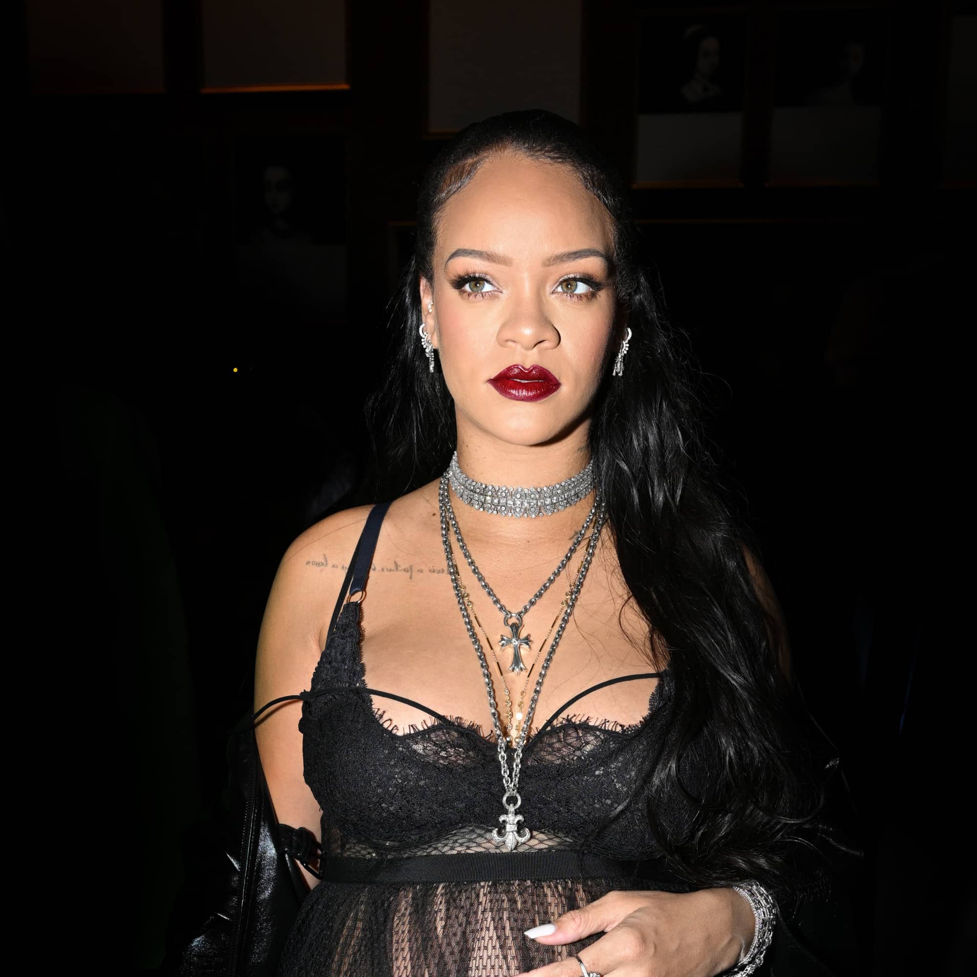 Since announcing her pregnancy, Rihanna’s style continues to push the envelope, rewriting the rules of maternity fashion. Continuing her fashionable Paris takeover, Rihanna attended Dior’s fall 2022 runway show in a sheer black lace dress that reminds us why she chose the “Bad Gal” Instagram handle. Donning an all-black ensemble, comprised of a sheer chemise worn over a lace bra and panties set, the singer embraced a goth aesthetic for Maria Grazia Chiuri’s catwalk. She finished her look with thigh-high patent leather boots, a leather trench coat, and layers of chain necklaces with a Chrome Hearts cross featured prominently.