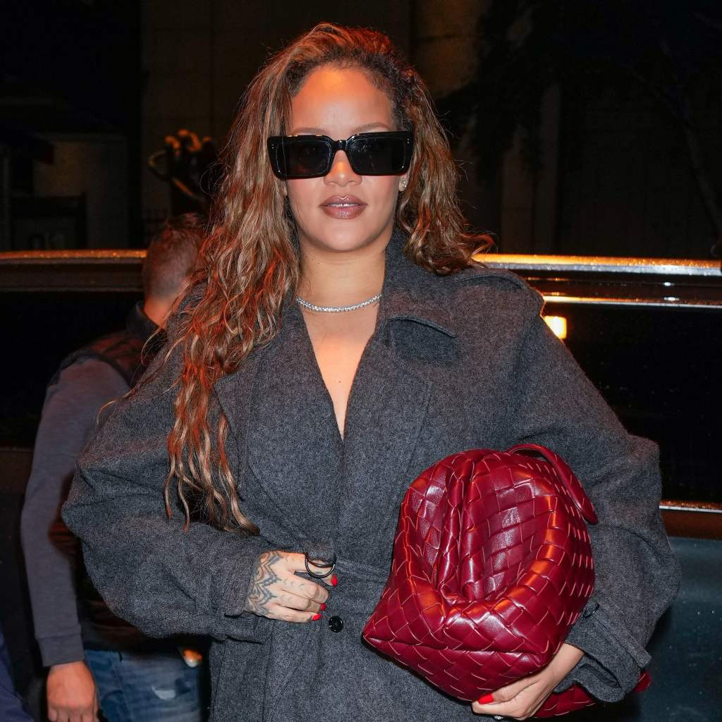 Rihanna has spoken: tiny purses are out. [Insert dramatic gavel slam here.] On Oct. 9, the Fenty Beauty founder was spotted grabbing dinner in New York City carrying an enormous red clutch that could practically double as a duffle. The woven Bottega Veneta bag was impossible to miss as the mom of two made the sidewalk her runway in a gray Dries Van Noten coat, black Balenciaga “pantaboots,” Gucci sunglasses, and a diamond necklace.