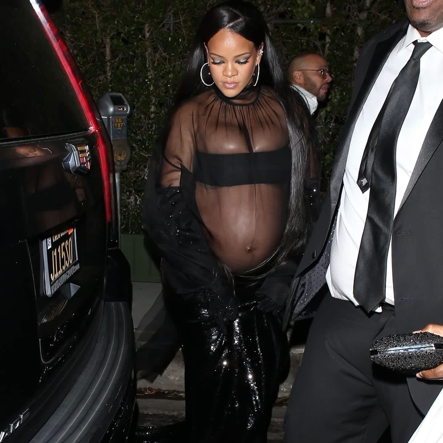 Rihanna’s maternity style has been anything but basic, and that sentiment definitely holds true for the outfit she chose to wear for an Oscars afterparty hosted by Beyoncé and JAY-Z at the Chateau Marmont. The singer and entrepreneur tossed aside any outdated bump-styling rules there may be with a gorgeous sheer gown by Valentino. Her daring look was from Valentino’s fall/winter 2022 collection and consisted of a super-sheer top with poofy organza sleeves and a sequin skirt. She wore only a black bandeau as a layering piece, highlighting her growing baby bump from underneath the bodice of the dress.