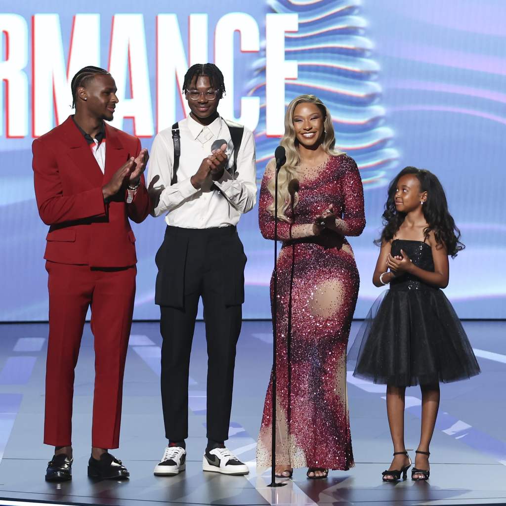James got to show off the dress’s full shine while helping present her husband with an award for breaking the NBA’s all-time scoring record. She also seemed to coordinate her color palette with the rest of her family’s looks, as seen when they joined together onstage. LeBron wore a classic black suit with golden hardware and jewelery to accept his award, while 18-year-old Bronny looked equally as fashionable in a bright red suit. 16-year-old Bryce wore black suspenders and a white button down, and 8-year-old Zhuri finished the group off strong by dressing in sequins just like her mom.