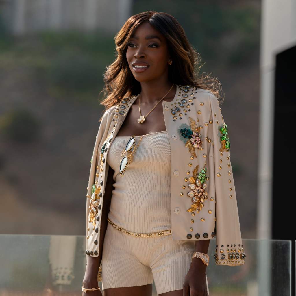 While most castmates simply shop their own closet, Emma Hernan did collaborate with creative consultant Kendall Finzer for her wardrobe of thigh-high slits and monochrome suit sets.
