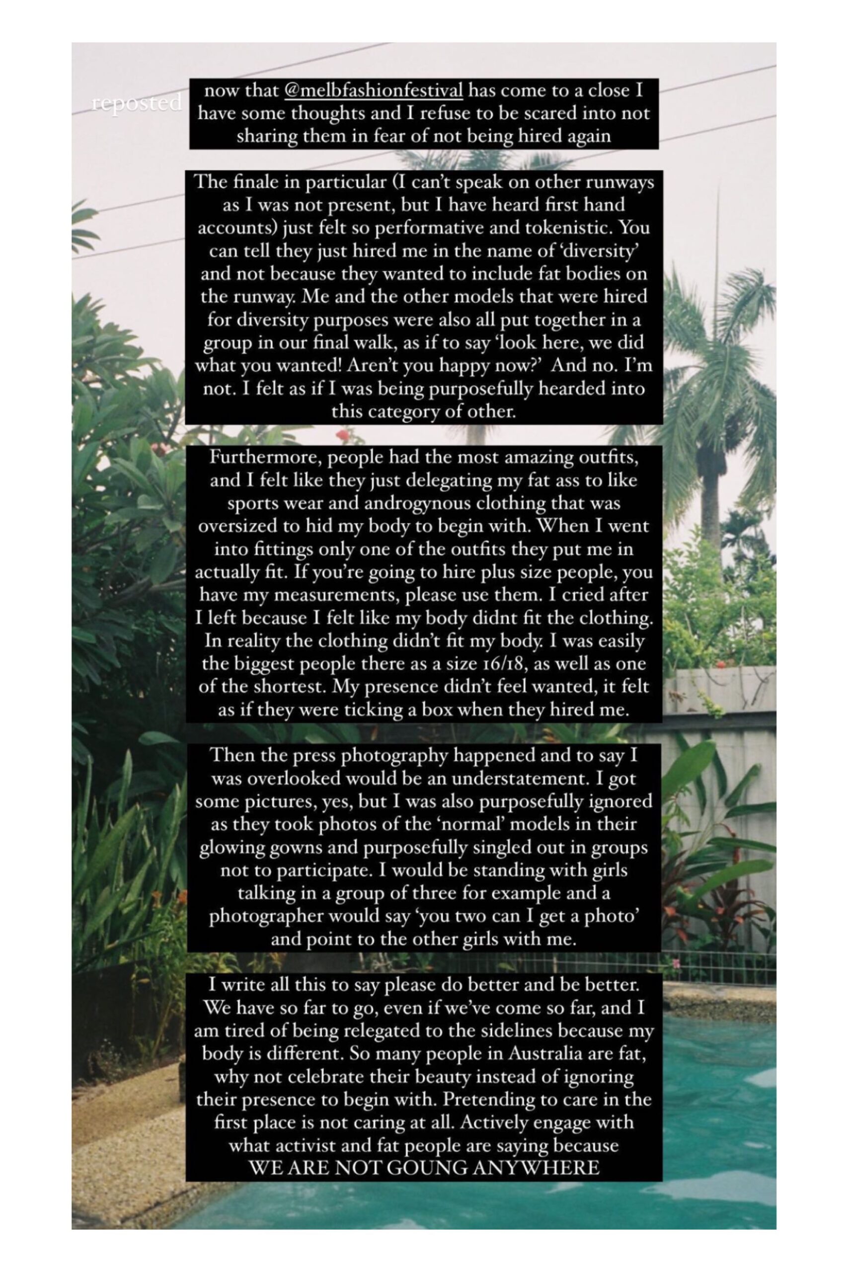 “Me and the other models that were hired for diversity purposes were all put together in group in a final walk as if to say ‘look here, we did what you wanted! Aren’t you happy now?’ And no. I’m not. Futhermore, when I went into fittings only one of the outfits actually fit. I cried after I left because I felt like my body didn’t fit the clothing.”