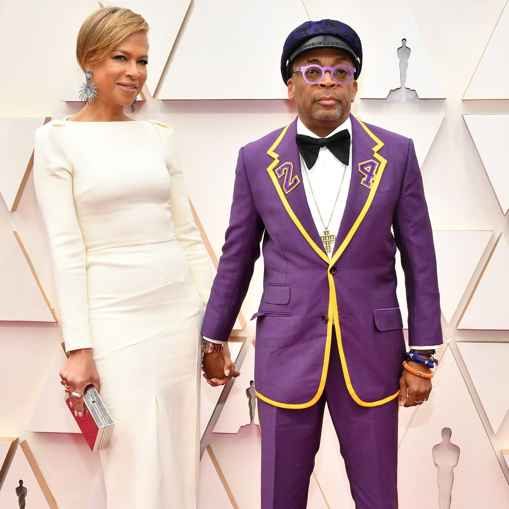 Spike Lee might be one of the world’s most famous New York Knicks fans, but at the Oscars, he repped purple and gold. On Sunday night, the director honored the late Kobe Bryant with a stunning custom suit with “24” emblazoned on both the front and back. His purple suit had yellow stripes going down the legs and jacket as a tribute to the Los Angeles Lakers superstar, who tragically died two weeks ago. Spike matched his glasses to his suit, and he even wore Nikes from Kobe’s range. Spike’s wife, Tonya, rocked a gorgeous long-sleeved cream gown that complemented the Lakers colors. Ahead, see photos of the beautiful suit honoring Kobe Bryant at the Oscars.