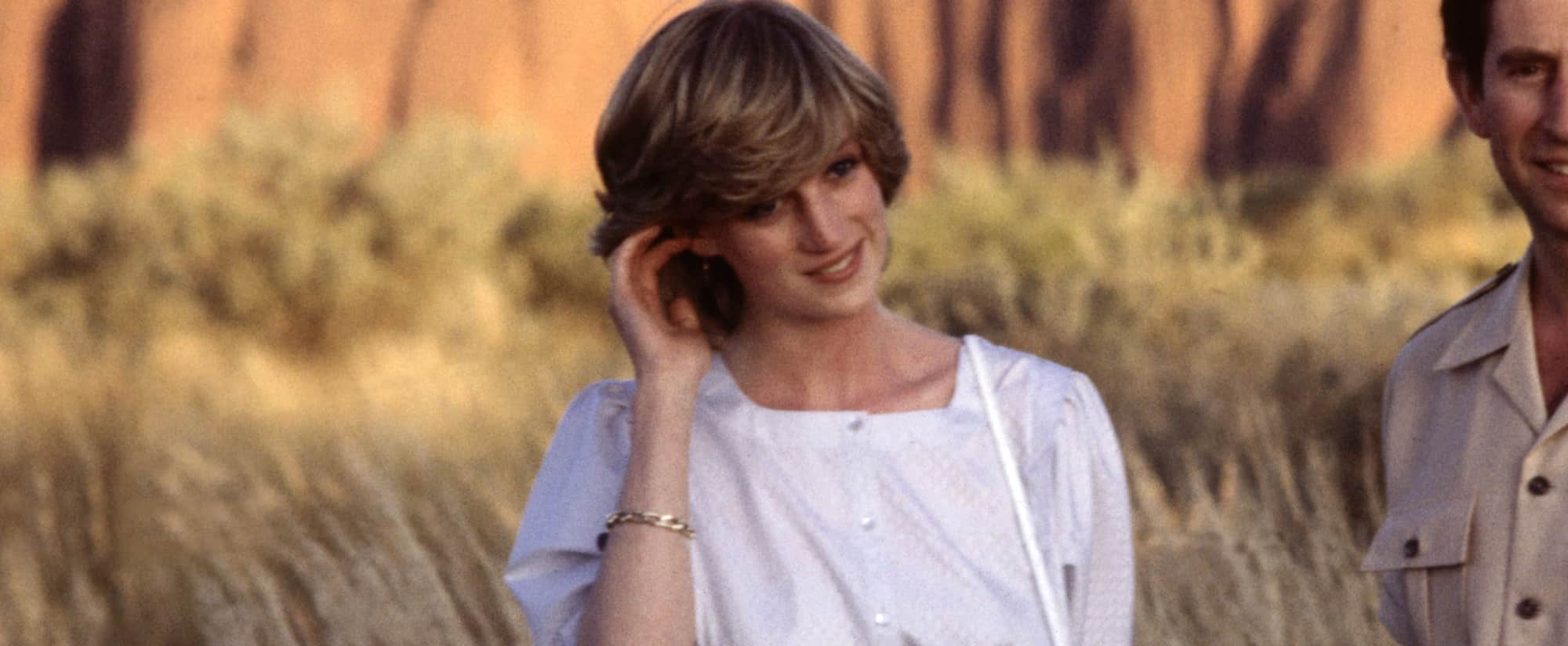Diana’s most similar shape that we could find is seen here, worn with a casual white shirtdress for a visit to Ayers Rock during a tour of Australia in 1983.