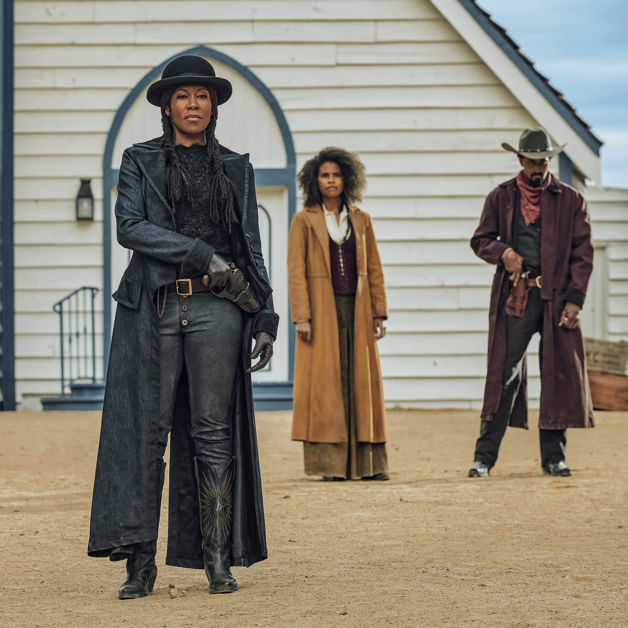 Messam started with her revenge-seeking hero: “Jonathan Majors as Nat Love always felt like Clint Eastwood in The Good, The Bad, and The Ugly for me, how he walks and talks and moves in costume. The loner that always had people around him who were strong.” With that classic, Western leading man in mind, Messam outfitted Majors in all the iconic tropes of Western films: denim and leather pieces that looked even better through a haze of gun smoke, sweat-soaked bandanas tied at the throat, and the perfect cowboy hat to hide his scar and squint into the sunset from beneath the dusty brim.