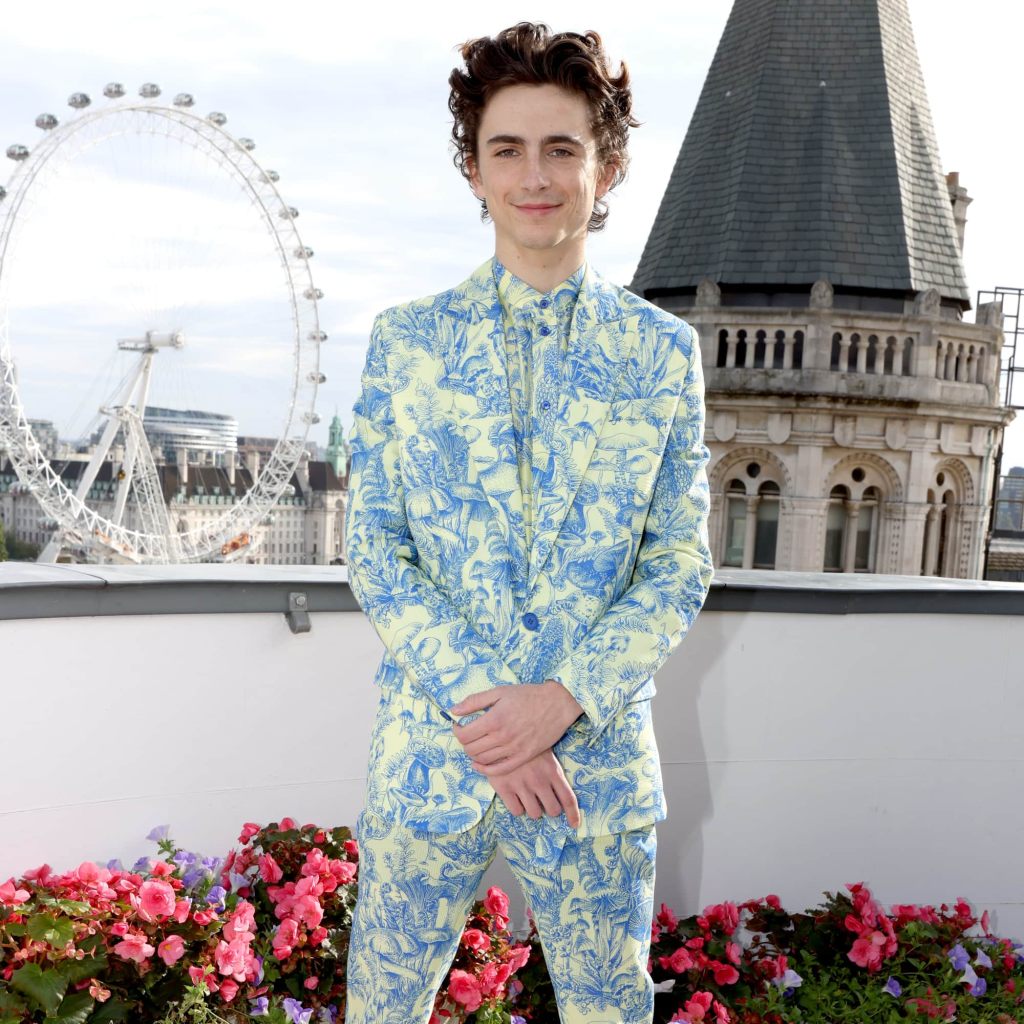 Stella McCartney’s team reinterpreted the brand’s signature Fungi Forest Organdy print from the spring/summer 2021 collection to customise Chalamet a suit, shirt, and tie in forest-friendly viscose and cotton for his London photo call appearance. He stood beside his fellow castmates, including Zendaya (who also wore a British designer in the form of a checkered skirt and chainlink top by Vivienne Westwood). Chalamet capped off his whimsical outfit with white leather Western boots, keeping the accessories minimal, so we could fully take in and appreciate the details in Stella’s intricate blue and lemon chiffon pattern – yes, those are mushrooms.