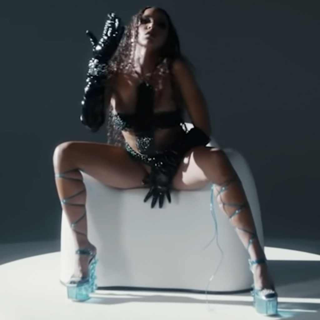 In true Queen of the North fashion, a closer look at Tinashe’s translucent blue MSXLA Nikita Heels ($90) also revealed ice dragons curled around the shoes, making the look even more badass from head to toe. She paired the outfit with a silver bracelet and black leather evening gloves that added an extra dose of extravagance to the scene as she draped herself across chairs and struck power poses for the camera.