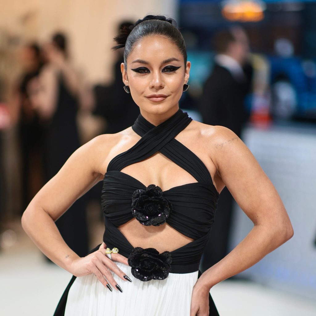Vanessa Hudgens took to the 2023 Met Gala red carpet in a Michael Kors gown that played into her signature penchant for bold fashion. The 34-year-old wowed in a flowy, black-and-white dress that featured a thigh-high slit, midriff cutouts, and two flower embellishments. Hudgens was styled by Jason Bolden, who has sourced many of the star’s outfits over the years. The actress has been embracing the slicked-back, high-ponytail hairstyle as of late, and once again opted for the sleek look this evening thanks to Danielle Priano. Tonya Brewer used fresh-looking beauty products to build out the star’s golden glow, and a sharp cat-eye design completed her look with edgy sophistication.