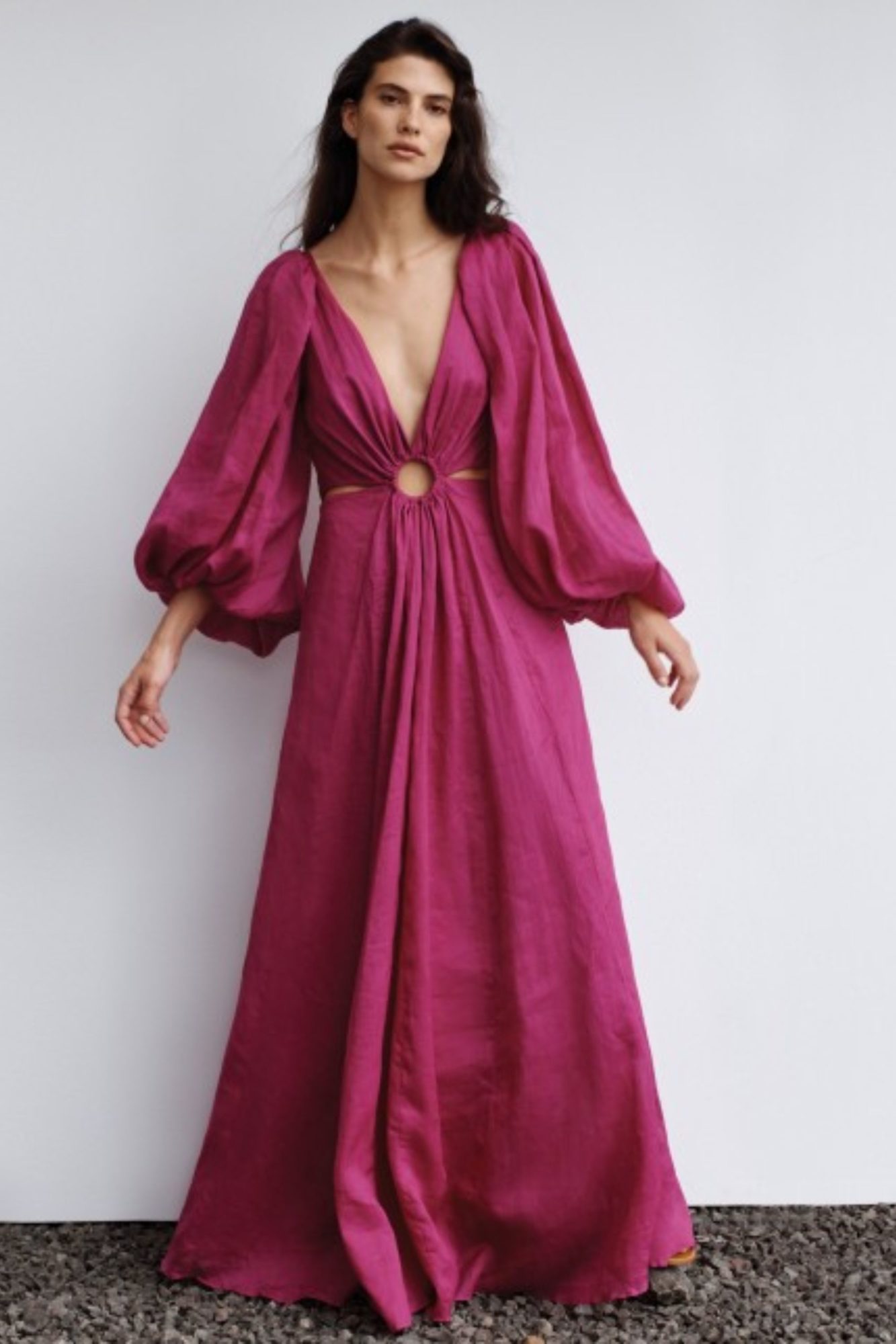 Cut-outs are super on trend right now, especially coming into summer. While I wouldn’t hesitate to wear something with cut-outs to a wedding, I’d probably be pickier about their size and placement. For example, I might check with the bride before wearing this NBD Lotte Gown ($238), given its exposing stomach cut-out and thigh split. Whereas, this Helena Dress in Fuchsia ($599) is less controversial, given its long sleeves and full-skirt coverage, with smaller cut-outs.