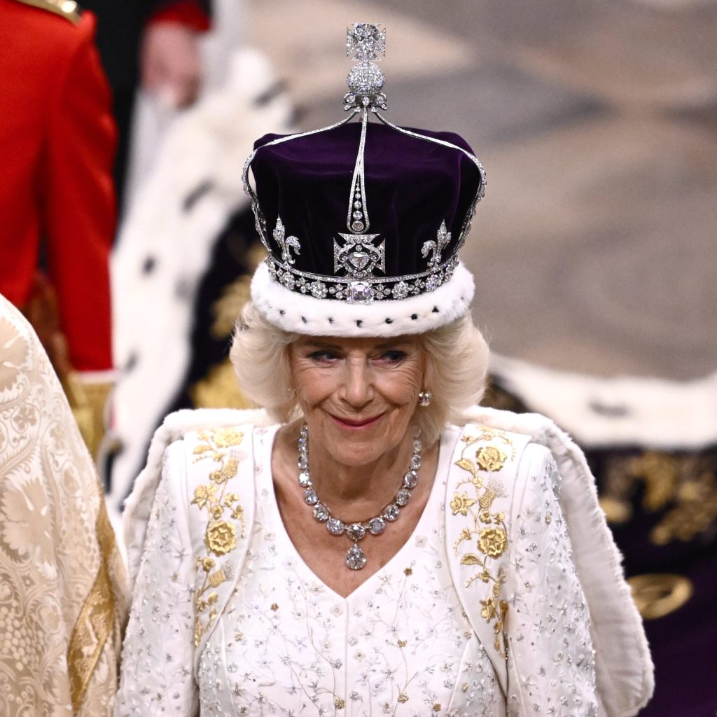 Queen Camilla chose a white gown with gold details that coordinated with her husband King Charles III’s white coronation robes for the day’s events. Camilla’s dress was designed by Bruce Oldfield and embroidered with daisies, forget-me-nots, celandine, and scarlet pimpernel, all meant to represent the king and queen’s love of nature. With it, she wore the same necklace that Queen Elizabeth II wore for her own coronation in 1953. It was designed for Queen Victoria and then worn by Queen Alexandra, Queen Mary, Queen Elizabeth I, and Queen Elizabeth II on their own coronation days. On top, Camilla wore an equally iconic crimson velvet ermine Robe of State that was originally crafted for Queen Elizabeth II’s coronation and was tailored today by Ede and Ravenscroft.