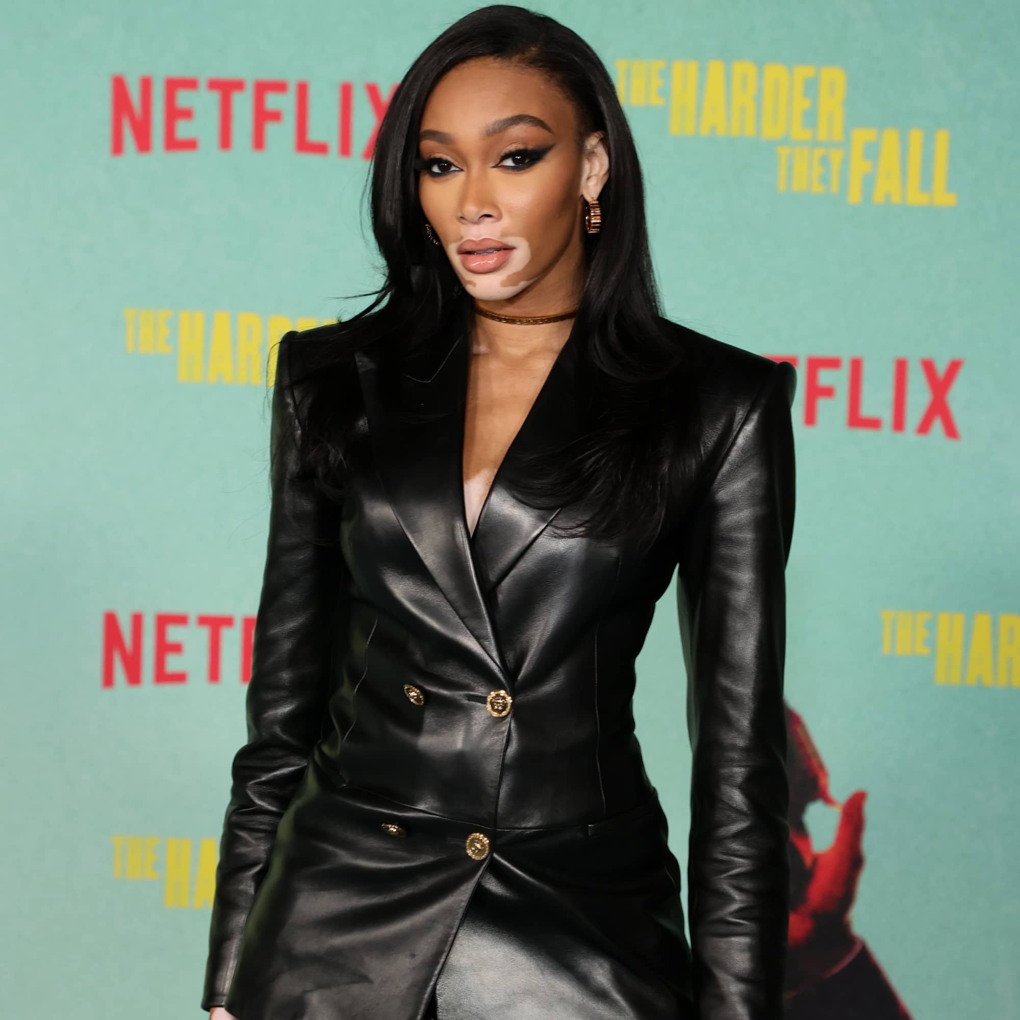 Winnie Harlow was among the many stars to show up for Netflix’s The Harder They Fall premiere in LA on Oct. 13. (Yes, Beyoncé was there to support husband JAY-Z, who has a producing credit on the film, although she didn’t walk the red carpet.) Winnie, on the other hand, made quite the statement in a black double-breasted leather Versace blazer, which nipped in at the waist and doubled as a minidress that she teamed with crystal-studded fishnet tights. Winnie played up the sparkle with embellished satin square-toe pumps and gold jewelry, including ridged hoops and a thin choker in the brand’s signature Greca pattern. The look had a ’90s feel, and with fellow stars Kehlani in baggy cargos, Teyana Taylor in Rick Owens high-tops, and Karrueche in a miniskirt, it hit right on the money. Read on for an all-angles view of Winnie’s fashionable moment that we’ll be talking about for the rest of the week.