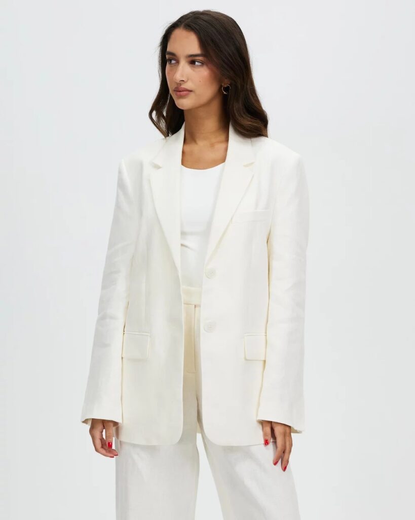 This antique white linen blazer will make any outfit look crisp. I’m eyeing it and the matching trousers.