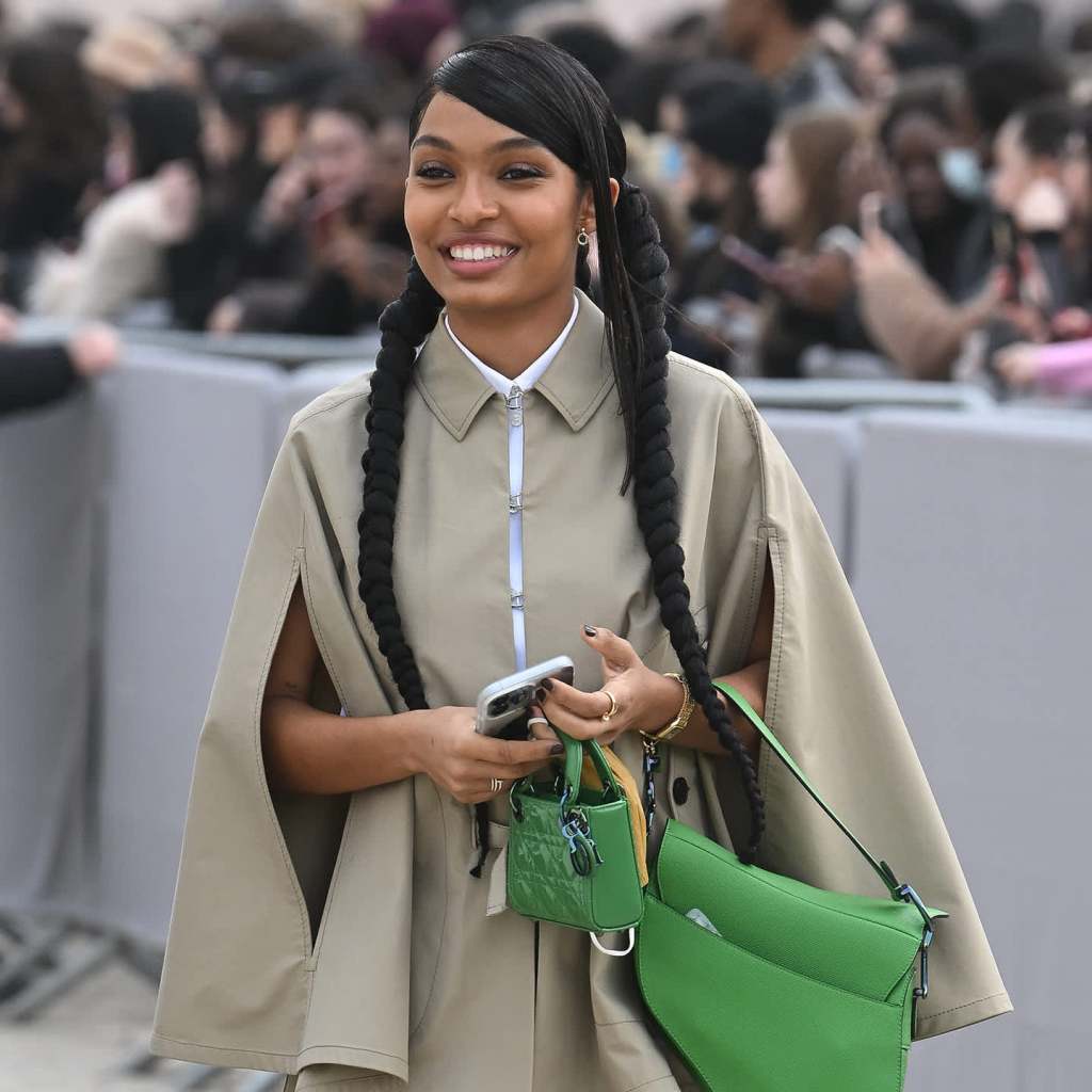 Yara Shahidi has touched down in Paris. The “Grown-ish” star was spotted posing outside Dior’s fall 2022 show in quite the unique outfit, curated by her stylist, Jason Bolden. Wearing her hair in two twisted braids, she dressed in a structured, khaki-colored cape and matching pleated skirt over a pair of casual biker shorts and black combat boots. She went with neutrals for her clothing but added a pop of color when it came to her striking accessories.