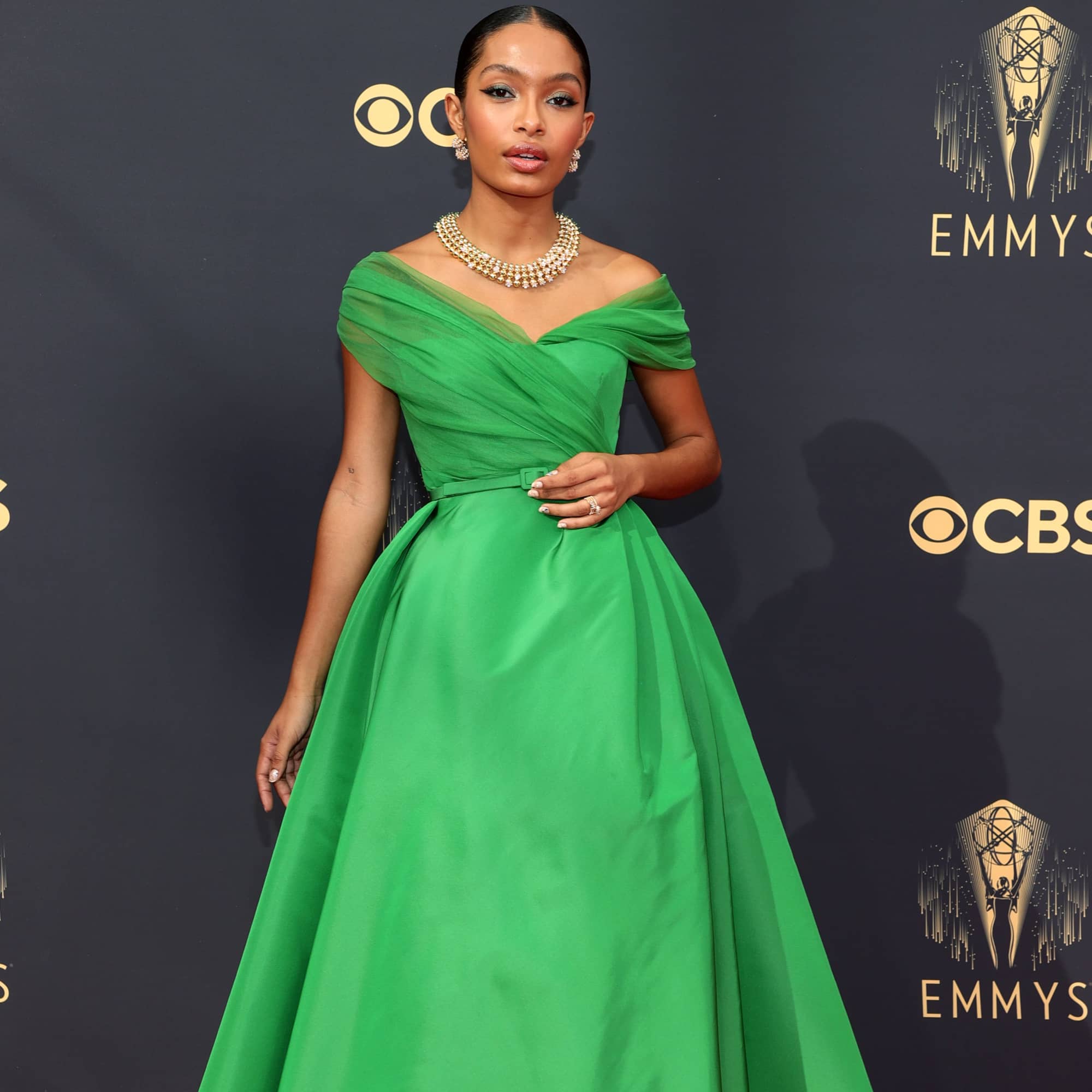 It is not uncommon for Yara Shahidi to show up on the red carpet in a Dior outfit, and of that she’s well aware. “I’m a proud member of the family,” she said, when interviewed about her look styled by Jason Bolden. The Haute Couture number she chose for the 2021 Emmys is a sophisticated, midi-length fit-and-flare with a thin belt at the waist and chiffon fabric wrapped in and out of a boned bodice that lays as off-the-shoulder sleeves. Yara opted for simple nude pumps and a golden choker necklace decorated in diamonds and tiny emeralds, which came complete with matching double ball drop earrings. Her eye makeup played to the electric green shade of her dress, which is really what struck us the most about this modernised silhouette that hails from the ’50s. Yara even told Karamo Brown what music she played to amp herself up for slipping into this outfit – some Duckwrth, Nas, Amy Winehouse, and The Neptunes. Ahead, check out Yara’s arrival for an evening where her show Black-ish was nominated for best comedy.