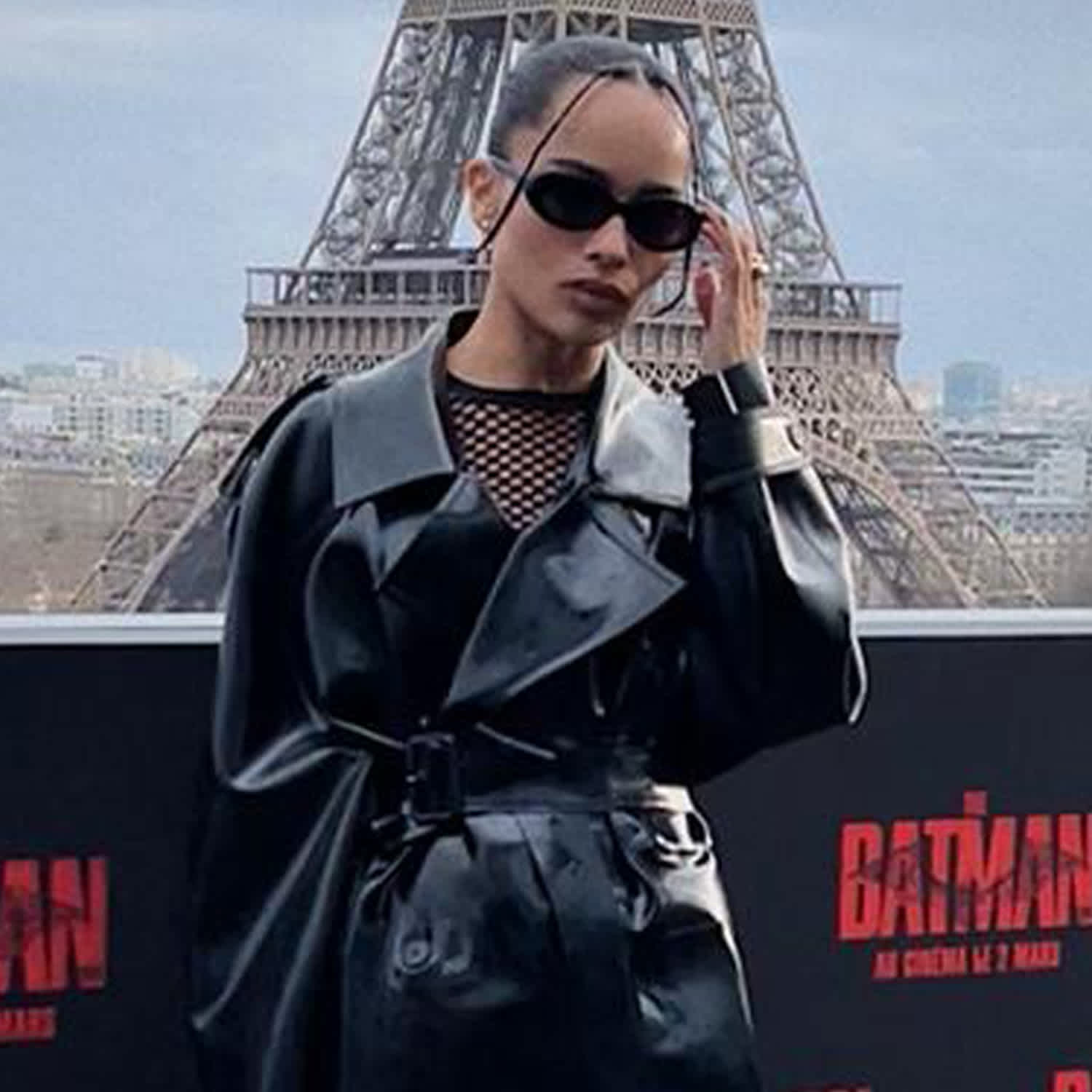 Kravitz layered the sleek trench coat over a mesh catsuit and completed the all-black ensemble with a pair of glossy heels, oval-shaped sunglasses, and a slicked-back bun with face-framing baby braids. As Kravitz worked the rooftops in front of the Eiffel Tower, radiating a style so wicked it should be a crime, she also took a moment to pose alongside Pattinson, who made Bruce Wayne look shabby in a two-piece suit and unlined trench coat.