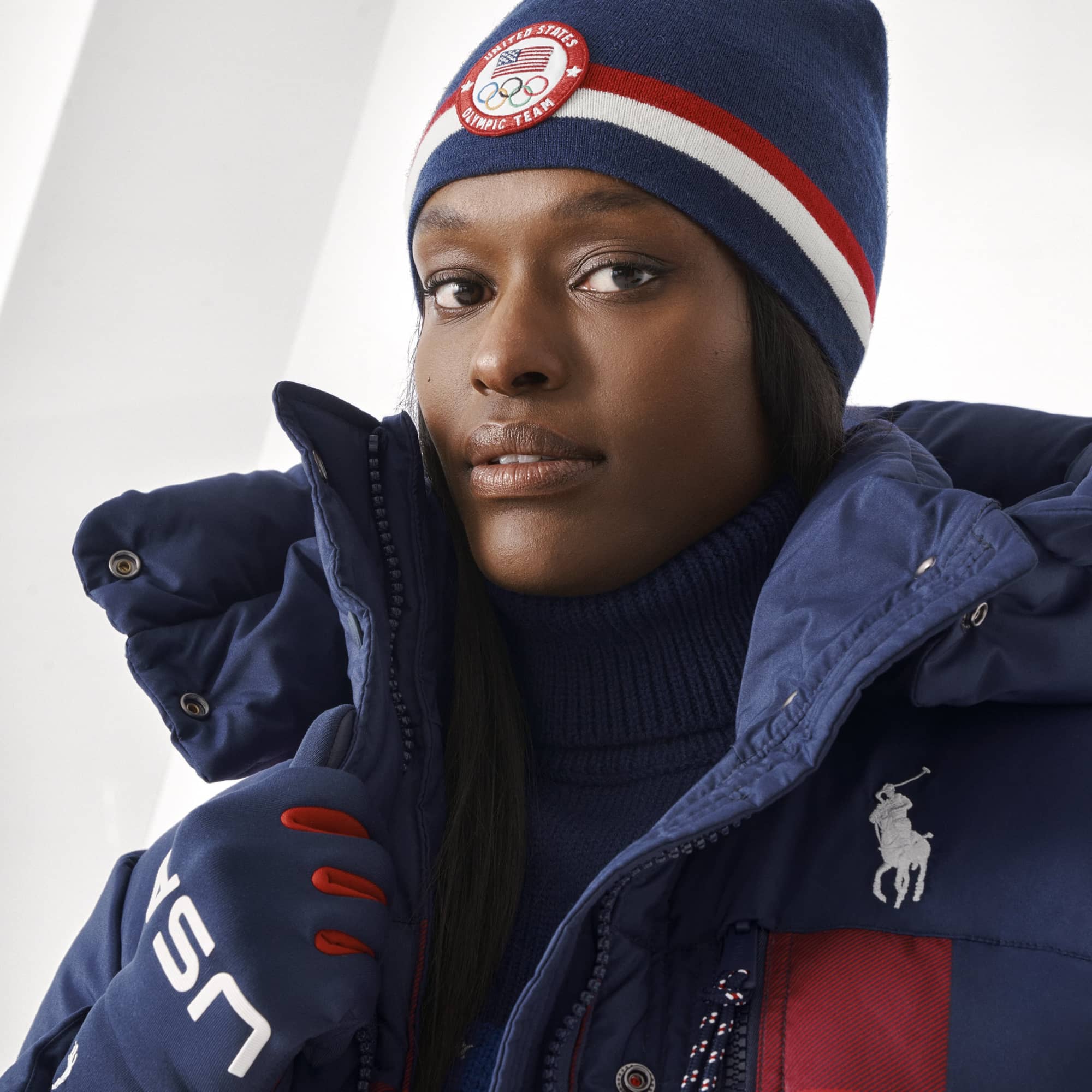 Continuing its journey to creating more sustainable fashion, Ralph Lauren announced in a press release that the closing-ceremony buffalo-plaid puffer jacket is made with recycled polyester and down, while the fleece pant, legging, gloves, and boots are made with recycled polyester. Also, the turtleneck sweater and knit hat are made from Responsible Wool Standard-certified US-grown wool.