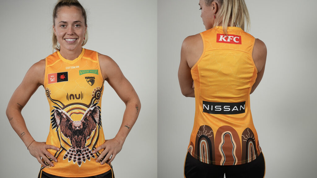 The Hawthorn Hawks 2023 guernsey, is named “Ballerrt Ngawan – Strong Sun”, and was designed by designer, Indigenous artist and proud Woi-Wurrung Wurundjeri and Yorta Yorta woman Simone Thomson. It features Bunjil Bagora, the Eaglehawk, guarding over Country, while the rising sun represents Bunjil’s creation of land and waterways and figures on the sides symbolise female warriors coming together for Ceremony. The ‘u’ and ‘n’ symbols above the sun represent the Hawks male and female players, emphasising that they’re ‘One Club’, connected and united.