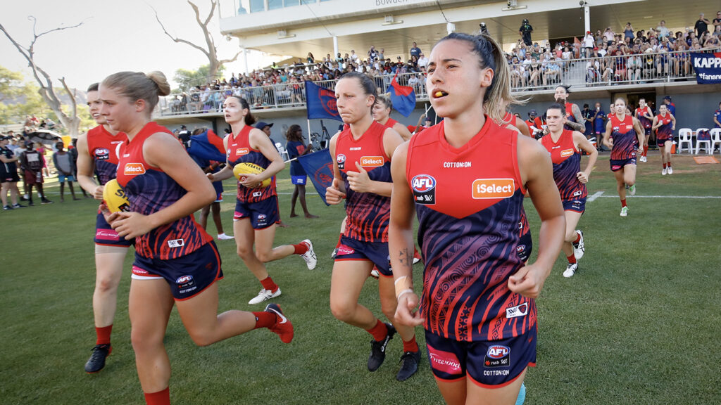 Swapping the round-ball for an oval, Newman’s fledgling footy career at Melbourne began with plenty of firsts. A foundation athlete of the AFLW, she was the first Indigenous woman to play for the Demons, and it was at Melbourne that she was first encouraged to use her artistic skills to share her culture, on the stage of the national competition.
