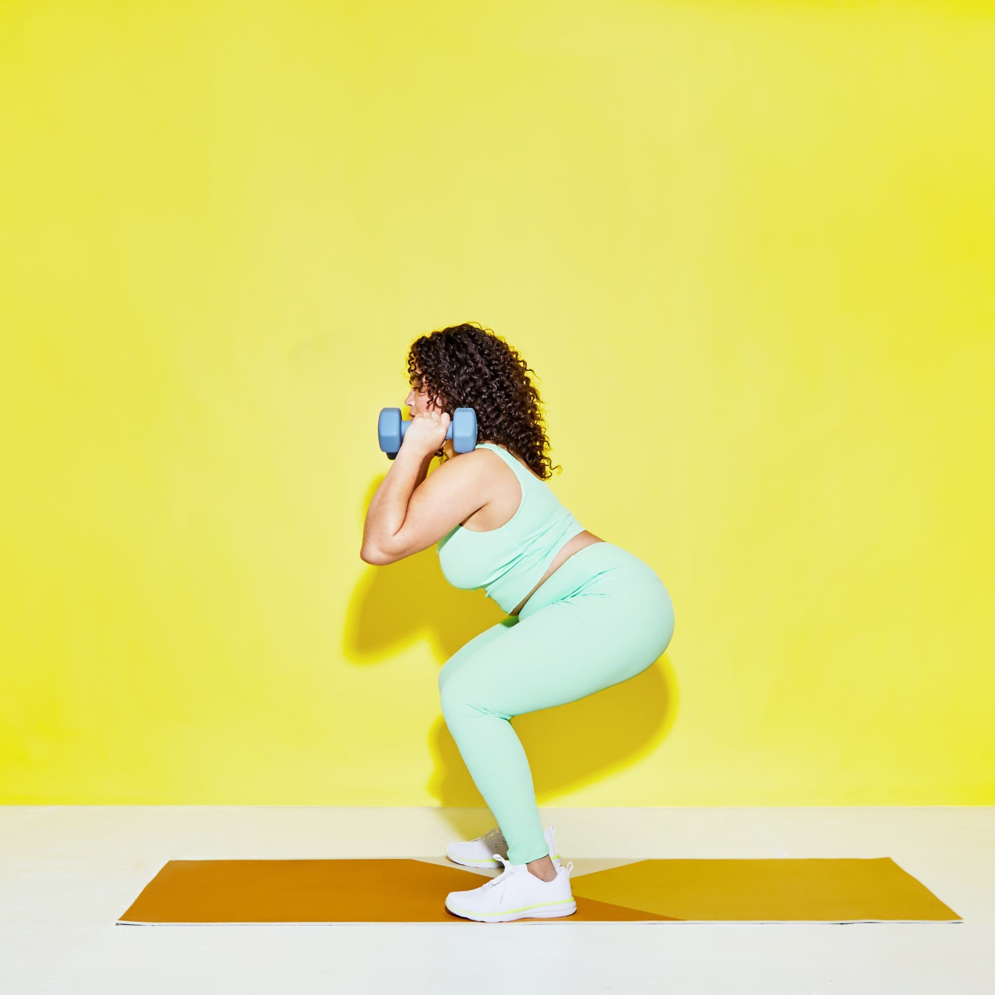 - Lower into a deep squat, grabbing your free weights with your hands.