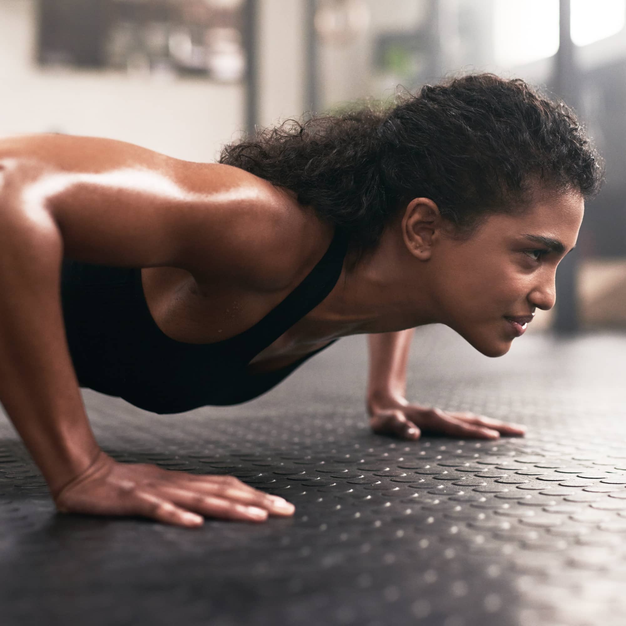 - With your core engaged, bend at your elbows and lower your torso toward the mat to perform a push-up. Don’t let your back slouch or hunch – try to keep it flat the whole time.