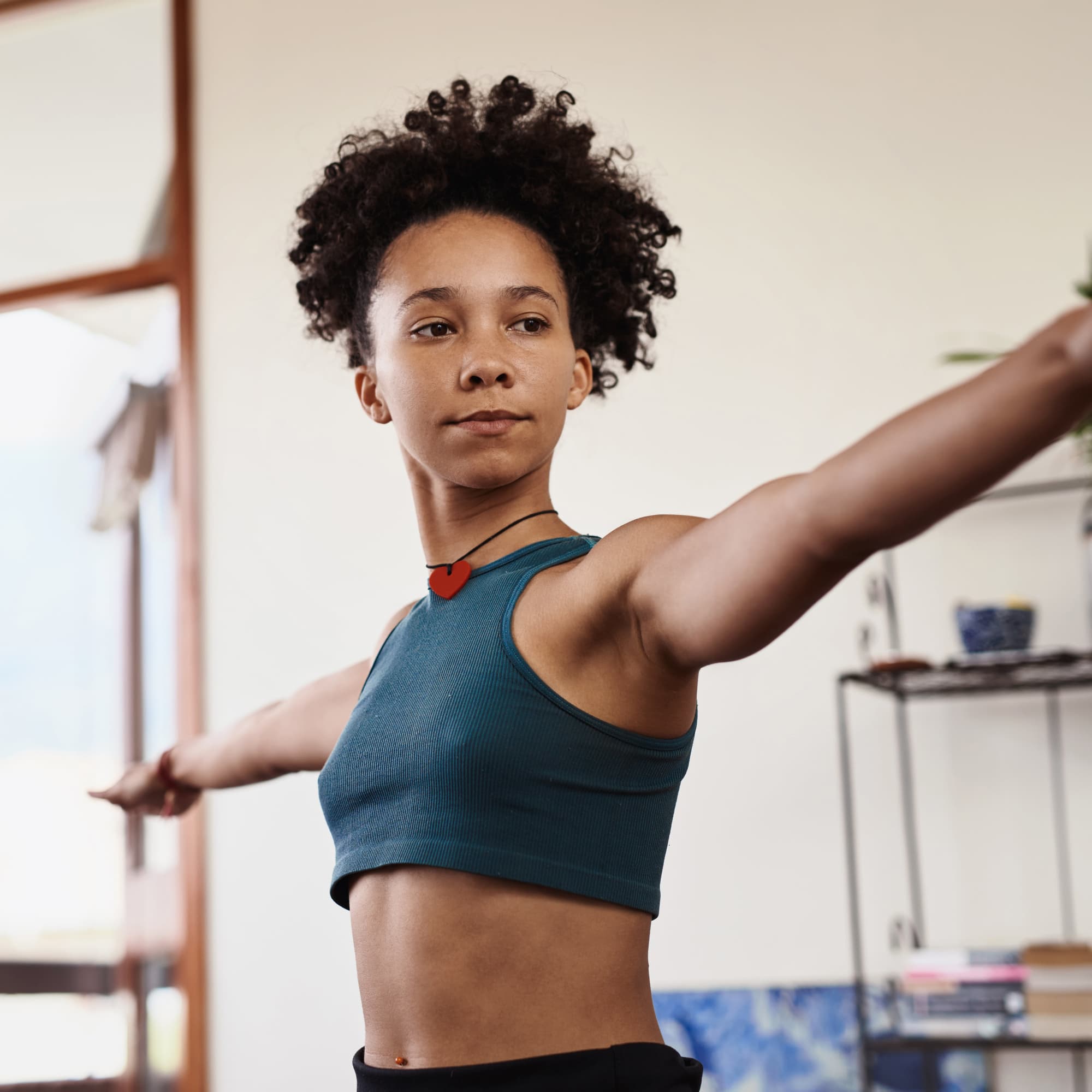 Warrior 2 wakes up your body and mind, said Huma Gruaz, RYT 500. The pose strengthens your legs, arms, and core while opening up your hips. On a mental level, “the pose is about reaching stillness in our minds, as we face changes or perhaps turbulences from the horizon,” she added, making it a great pose to start your day with.