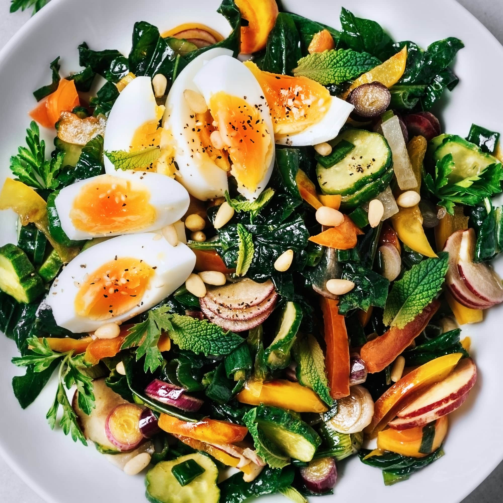- Lunch: A large salad filled with a variety of fresh raw veggies with some protein, such as a half cup of white beans or three ounces of shrimp.