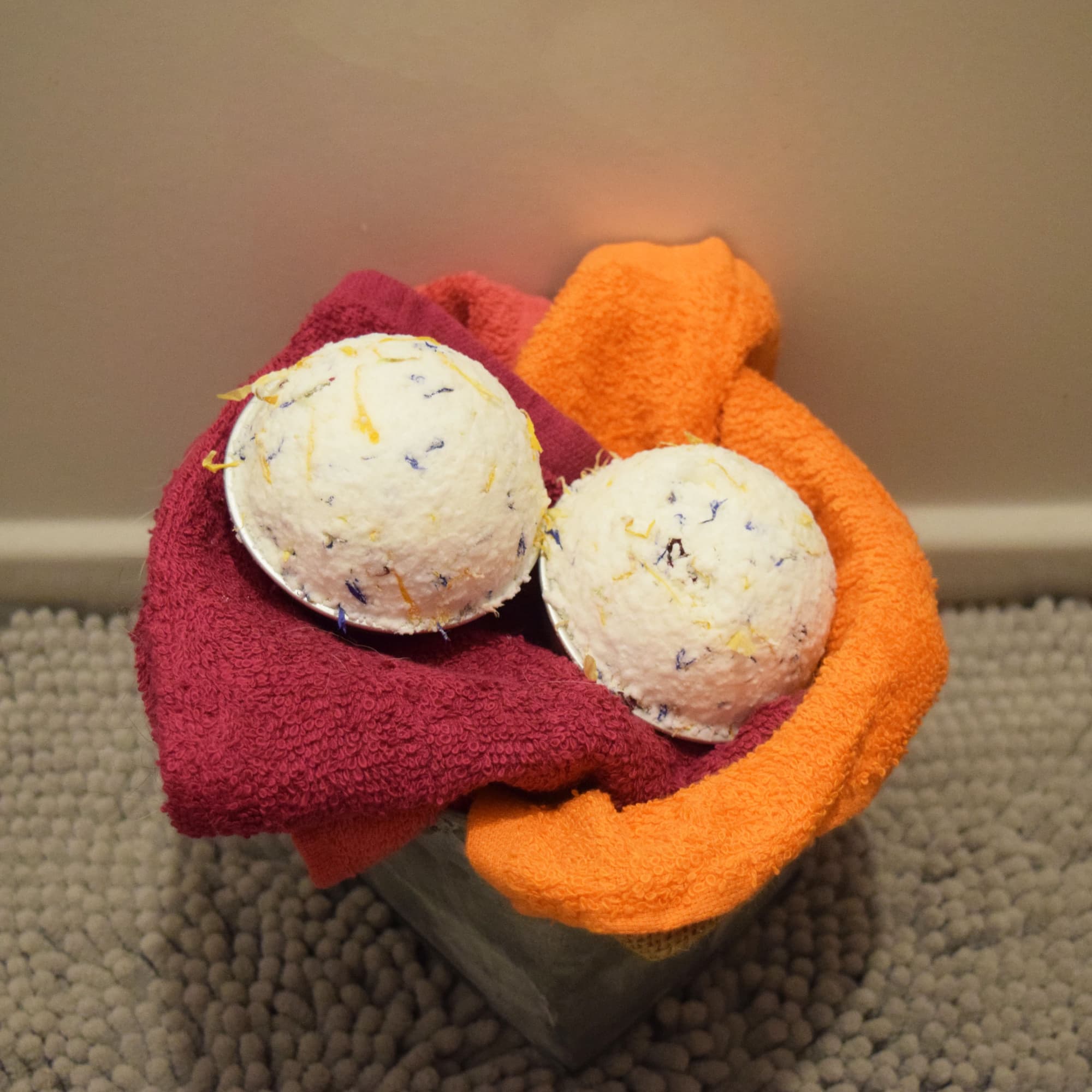 I also added dried flowers to my bath bombs because I thought it would be pretty, and while they looked pretty, I wouldn’t recommend actually doing this. Not only can they be problematic in your tub drain but you’ll end up with flower pieces stuck to you . . . everywhere.