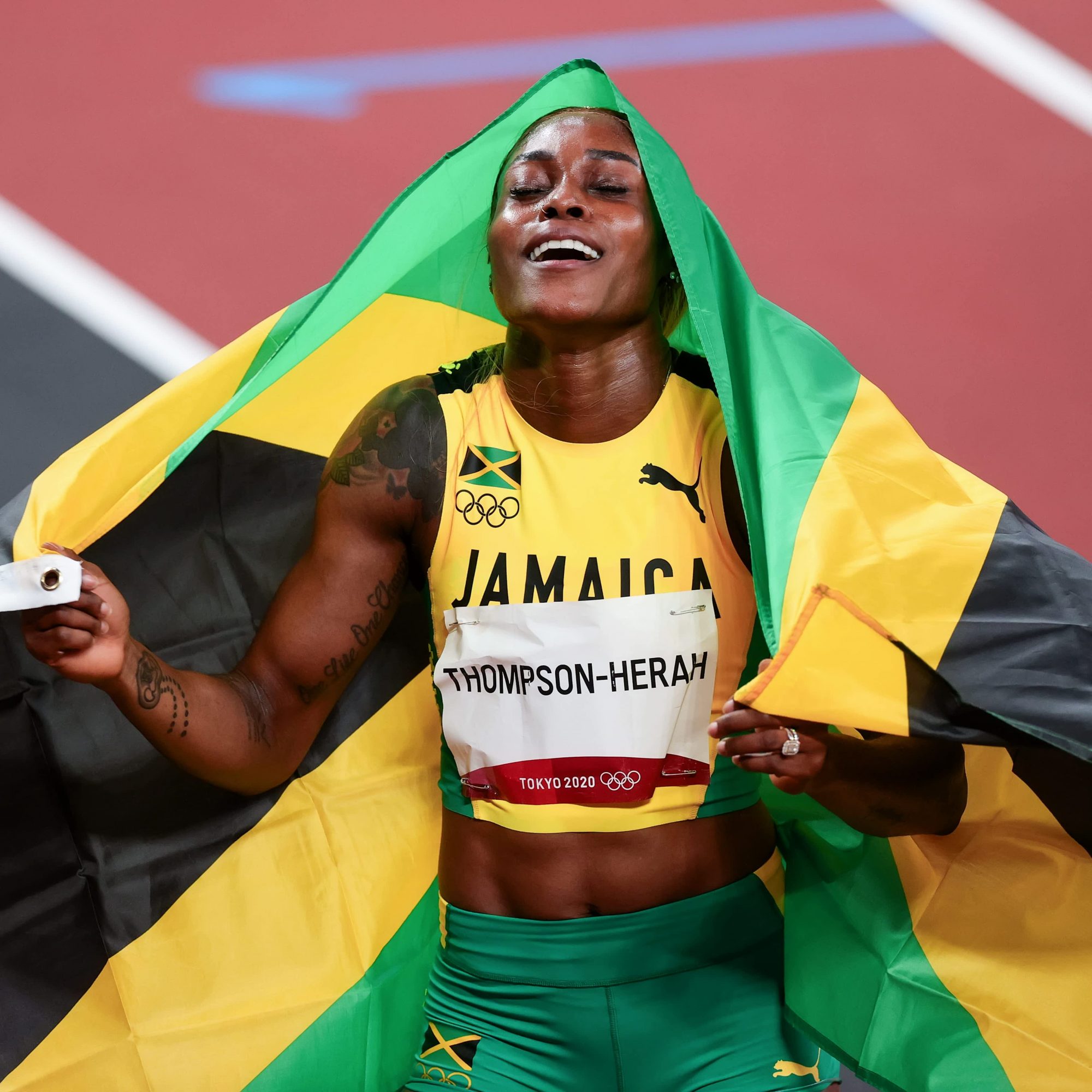 Joyner’s 1988 record of 10.61 seconds was set in Seoul. Her 100-meter world record of 10.49 seconds still stands. Thompson-Herah believes she can sprint past that time as well, telling reporters after her race, “anything is possible.” The track star’s win is even more impressive given an Achilles injury that she thought would keep her out of the Tokyo Games less than two months ago. However, her persistence drove her past the finish line, and she plans to keep pushing herself. “I have more years. I’m just 29; I’m not 30, I’m not 40. I’m still working,” she said, according to CNN. See photos of Thompson-Herah’s well-deserved celebratory reaction to her gold medal moment, ahead.