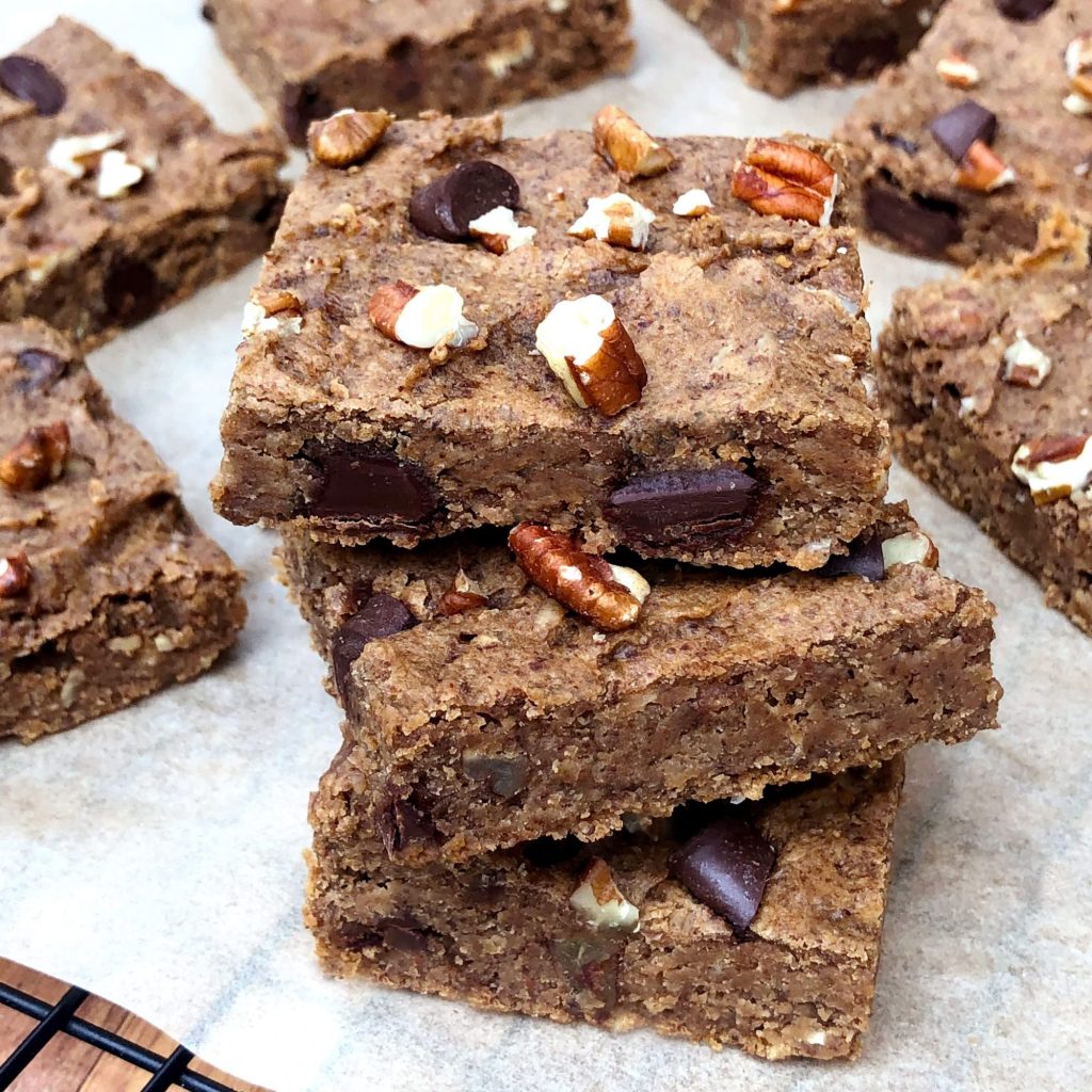 The dough for these vegan blondies is made with rolled oats, almond butter, beans (I know, shocker!), and flaxmeal to give them that buttery-soft and chewy texture. They’re protein-packed, sweet, nutty, chocolaty, and so freaking delicious.
