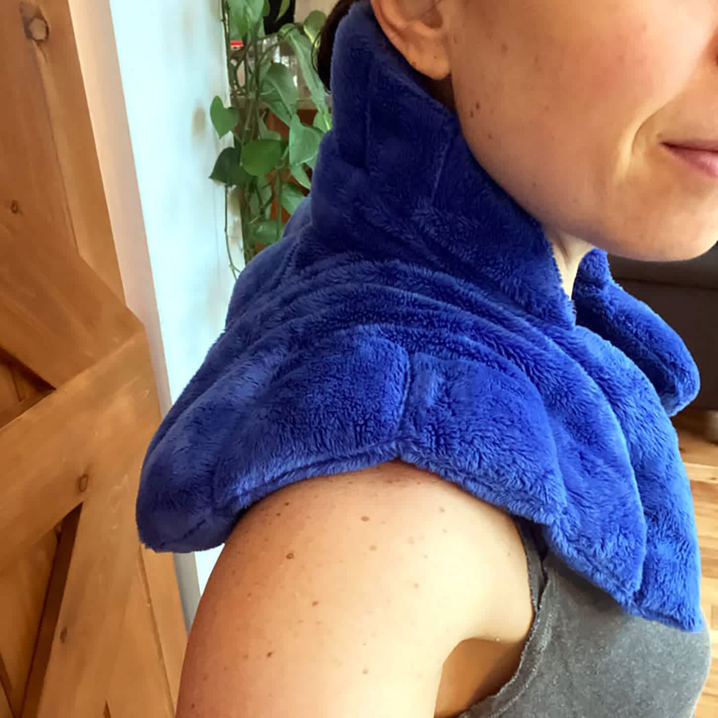 The first step is to warm up the area and get the blood flowing. While a hot shower works well, I don’t always have time, so I use this Huggaroo Weighted Neck and Shoulder Heating Pad. I just pop it in the microwave for four minutes, and then let it rest on my upper back, neck, and shoulders for 15 or so minutes. That’s usually enough time to warm up the area. Sometimes just doing this is enough to get relief if the knot isn’t too big.