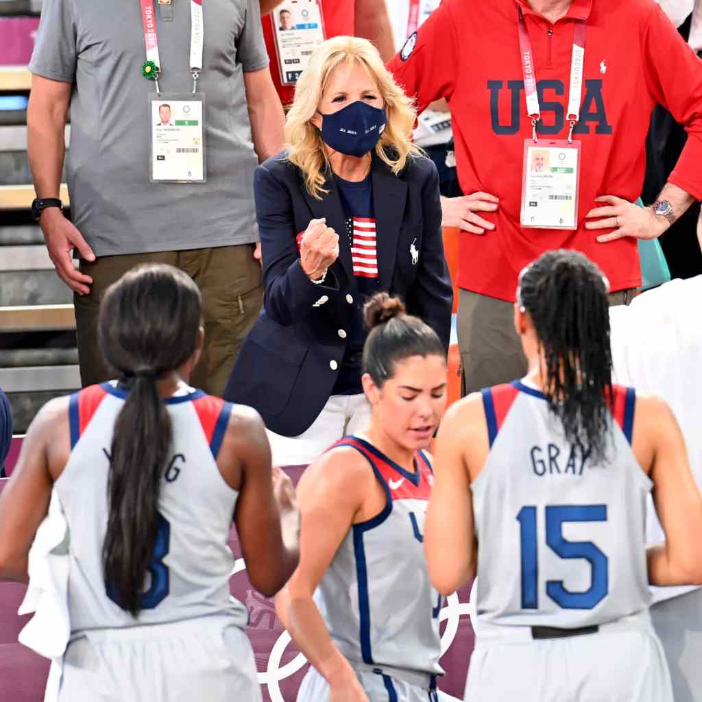 Jill Biden has been showing her support for Team USA. The first lady visited Tokyo for the 2021 Olympics during a three-day trip, and after attending the opening ceremony on Friday, cheered on Team USA during events on day one of the Games. Dr. Biden attended women’s 3×3 basketball with French President Emmanuel Macron (Team USA won against France 17-10), swimming prelims, and the USWNT game against New Zealand, where the US won 6-0. While she was at the Tokyo Aquatics Centre, USA swimmers chanted “Dr. Biden,” to which the first lady responded “thank you” with a wave.