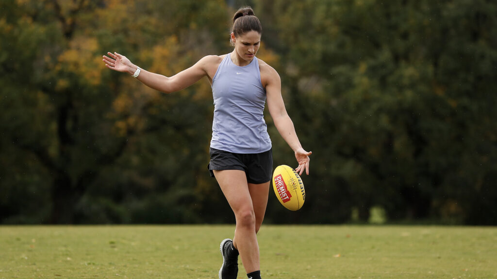 “I remember my coach saying, ‘You’re playing in this position’ and showing me on the board where I was — it was centre half-back. I didn’t know anything about football, so I thought I’d just run to the spot on the field. I wasn’t really sure what I was supposed to do,” she laughs. “It was such great fun. I went straight into footy from then on and gave away everything else I was doing at the same time.”