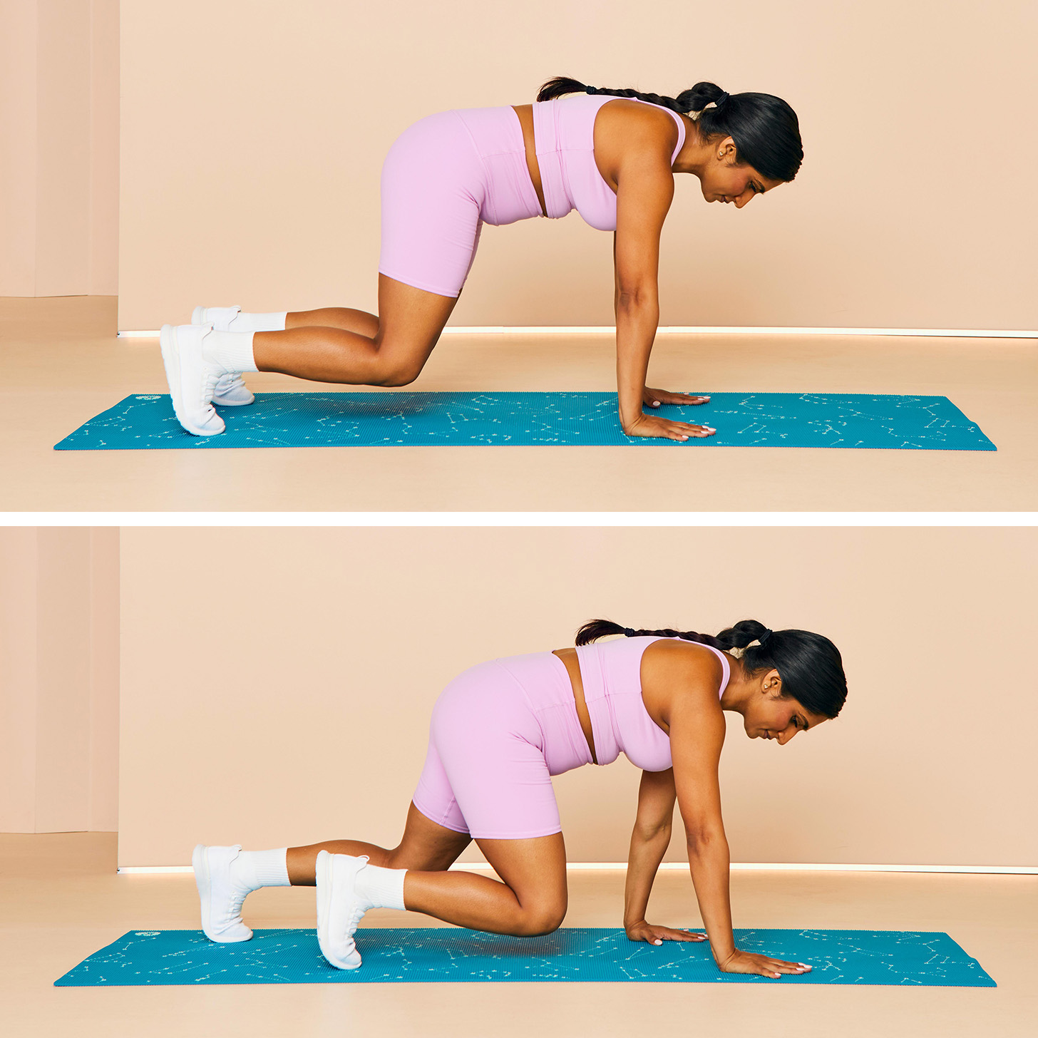 - Begin on all fours with your hands directly below your shoulders and your knees beneath your hips.
