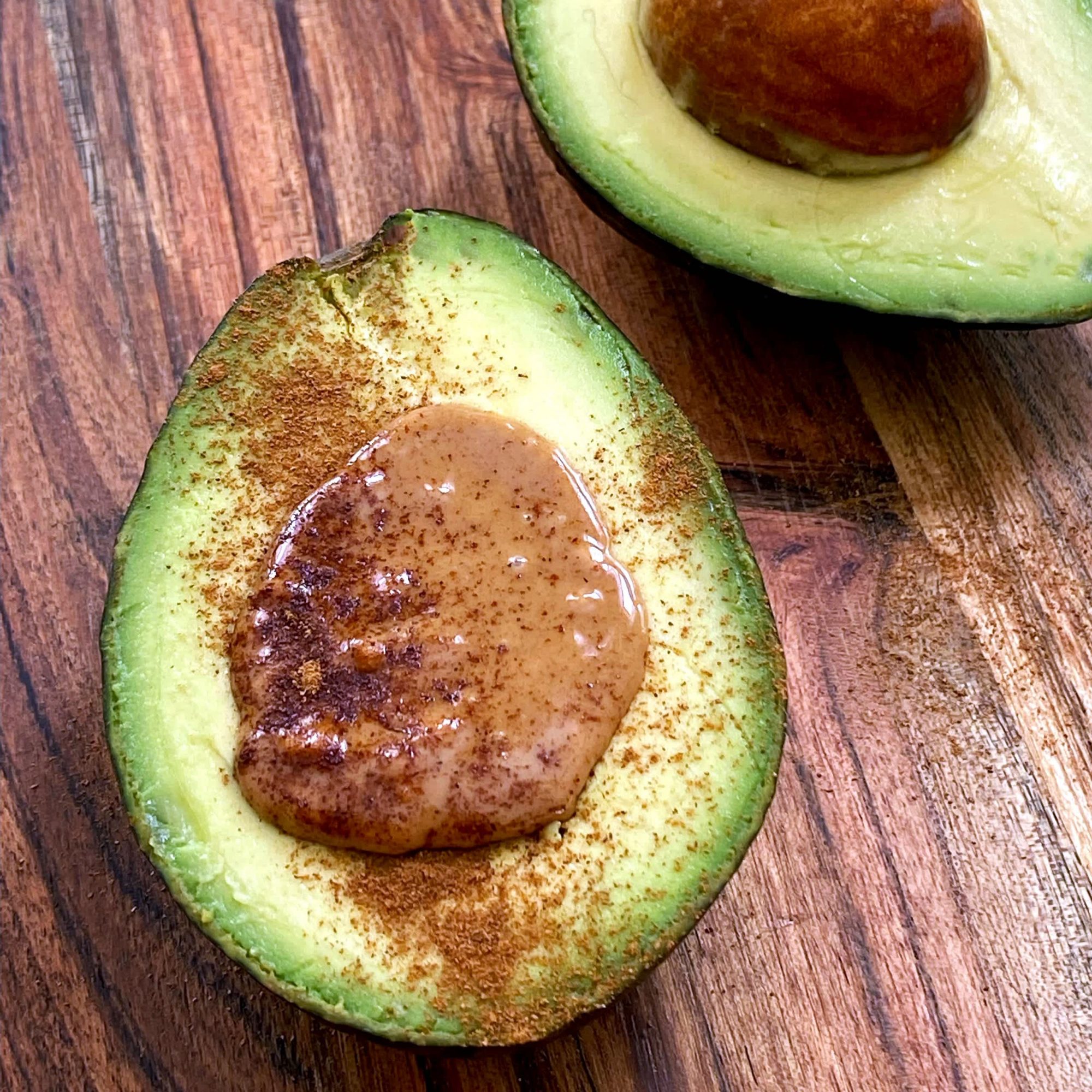 The variation I made was shared by Nicole Modic (@kalejunkie on Instagram): cut an avocado in half. Scoop about one tablespoon of natural peanut butter (I used crunchy, salted) into the side without the pit. If you don’t have peanut butter, any nut butter works. You can also use sunflower seed butter if you’re nut-free. Sprinkle with cinnamon and enjoy spoonfuls right out of the peel. “A drizzle of honey and flaky salt would also be a great addition,” Modic suggests in the caption, but I didn’t do that.