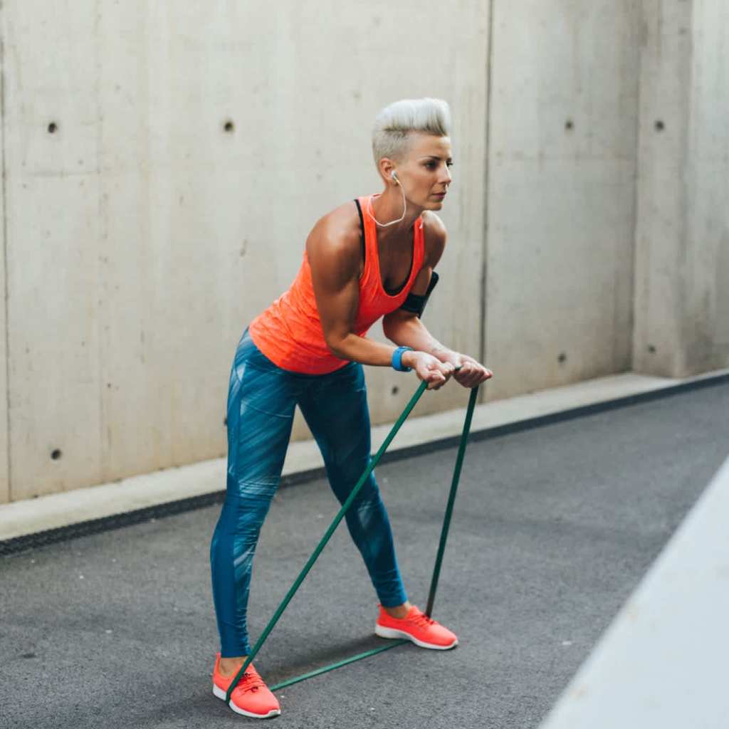 - Step onto the middle of the resistance band with both feet and hold on to each end, keeping your ankles under your hips and your knees slightly bent. Bend your elbows straight back, pulling your shoulder blades together.
