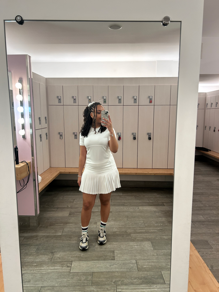 I started out with the outfit, because looking the part is just as important as playing it. I matched Tashi Duncan’s white pleated performance skort, copped from the official Wimbledon store (to show I mean business, obviously). I was in full tennis gear, with my white t-shirt and skort, quite literally down the Wimbledon socks – Sporty Spice eat your heart out. I topped off my hairstyle with a white scrunchie, like Zendaya’s hair bow at the “Challengers” UK Premiere.