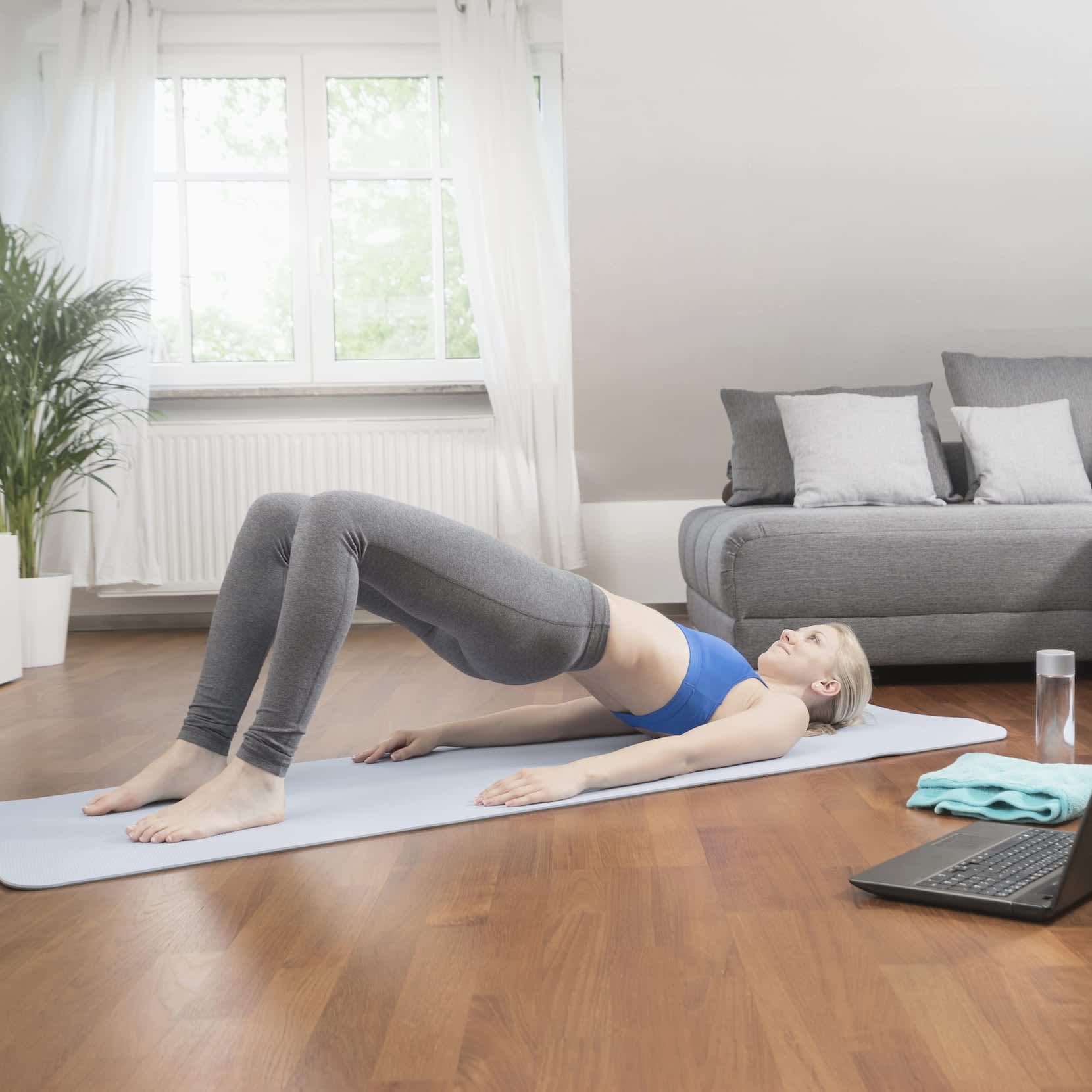 Apart from figuring out your shoe preferences, before starting an at-home workout program, assess your environment and make the necessary adjustments so you can exercise safely. Thieme suggests giving yourself at least six square feet of space, clearing the floor of objects you could trip over or that pose danger, and paying attention to the temperature of the room.