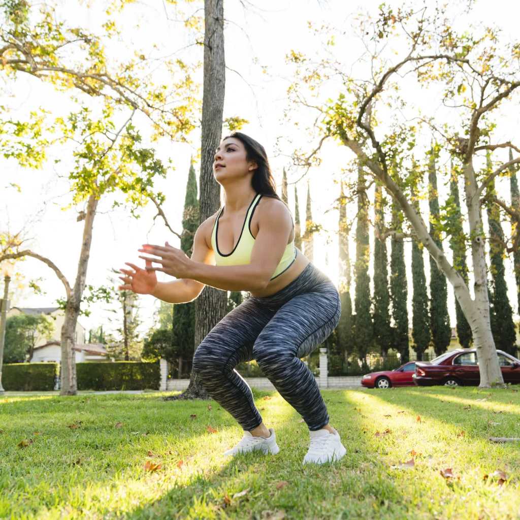 “You should think planks, squats, push-ups, and jumping,” she says.