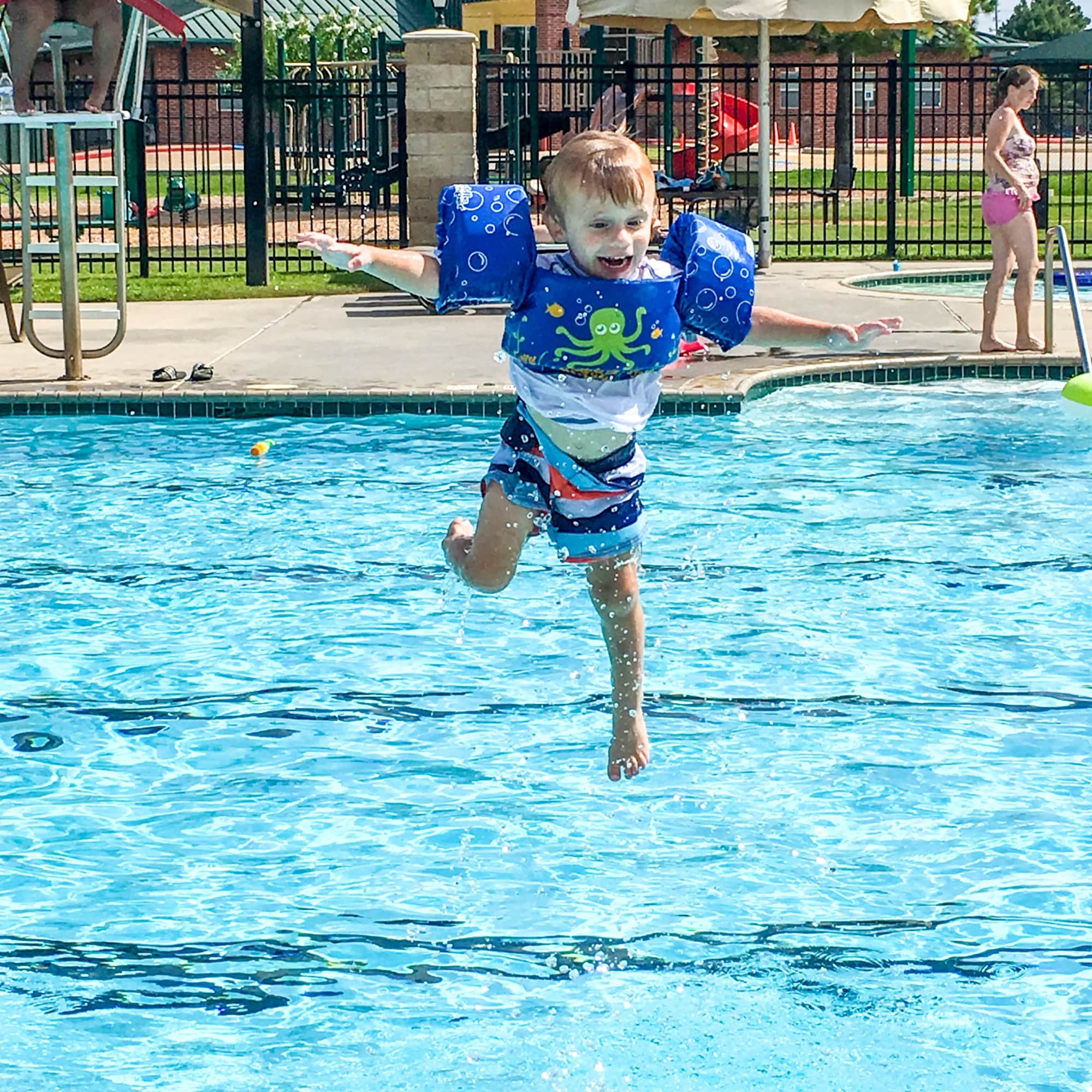 When we first began taking our toddler to the pool, I noticed that almost as ubiquitous as moms slathering pasty white sunscreen on squirmy kids was the presence of “puddle jumpers,” a combination of a life vest and arm floaties. I saw toddlers and preschoolers alike wearing these brightly colored vests, buckled behind the back, as they bobbed and played in the water. I was new to child water safety at this point, and I looked at them with delight – a much better option than those useless blowup water-wing sets that served no real purpose in keeping anyone above water. I bought one the next day, and there hasn’t been a trip to the beach, community pool, or water park without it, ready to be strapped around my child’s chest.