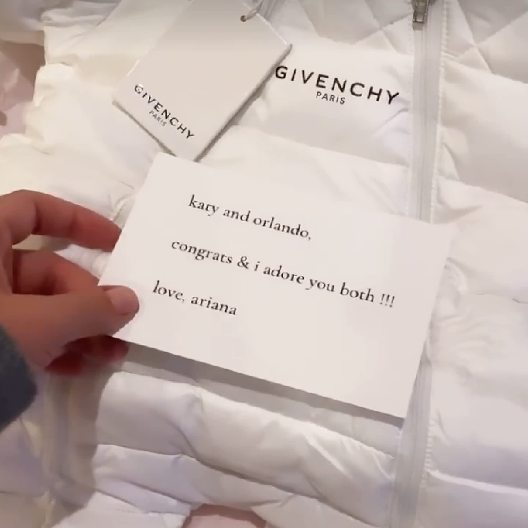 Ariana Grande sent Katy Perry and Orlando Bloom one heck of a baby gift! In a recent Instagram story, Katy publicly thanked the “7 rings” singer and showed off the stylish white Givenchy baby snowsuit she received for her daughter, Daisy Dove.