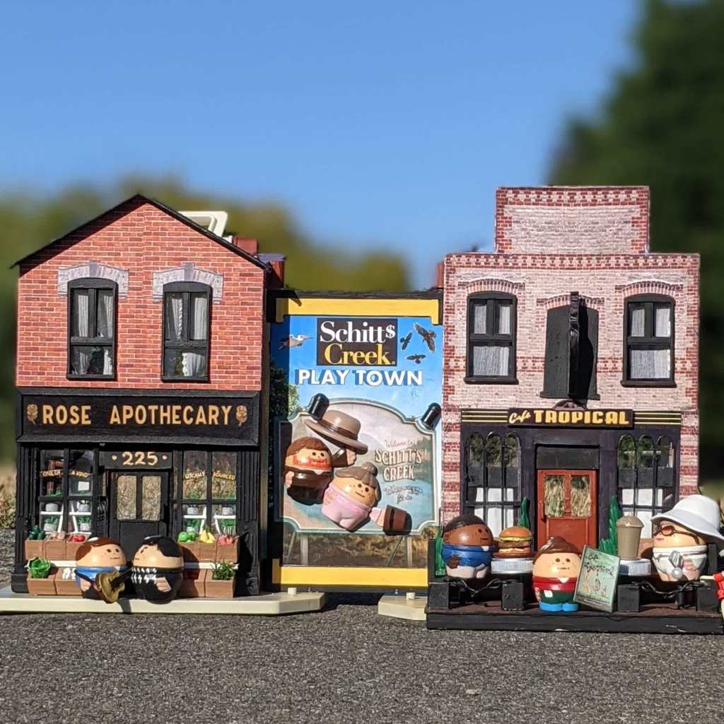 Seeing as Lego devastatingly opted out of producing that adorable Rosebud Motel Lego set idea for the masses, Todd Cameron took matters into his own hands to make Schitt’s Creek playtime a reality for himself and his son. The same Canadian dad who went viral for decorating his yard with a David Rose skeleton for Halloween, Todd spent a whopping five months meticulously transforming his vintage Fisher-Price toys into a miniature playtown inspired by the Pop TV sitcom. The setup features replicas of various spots around the fictional town, including Rose Apothecary, Café Tropical, Bob’s Garage, Roland and Jocelyn Schitt’s house, and even Mutt’s barn – plus rotund Little Tikes figures designed to resemble the show’s main characters.