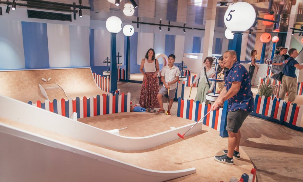Featuring a world-class two-level, 18 hole crazy golf course, corn hole, shuffleboard, old and new school arcades, karaoke party rooms and diner-style pub food and beverages. Phew! We need to catch our breath.