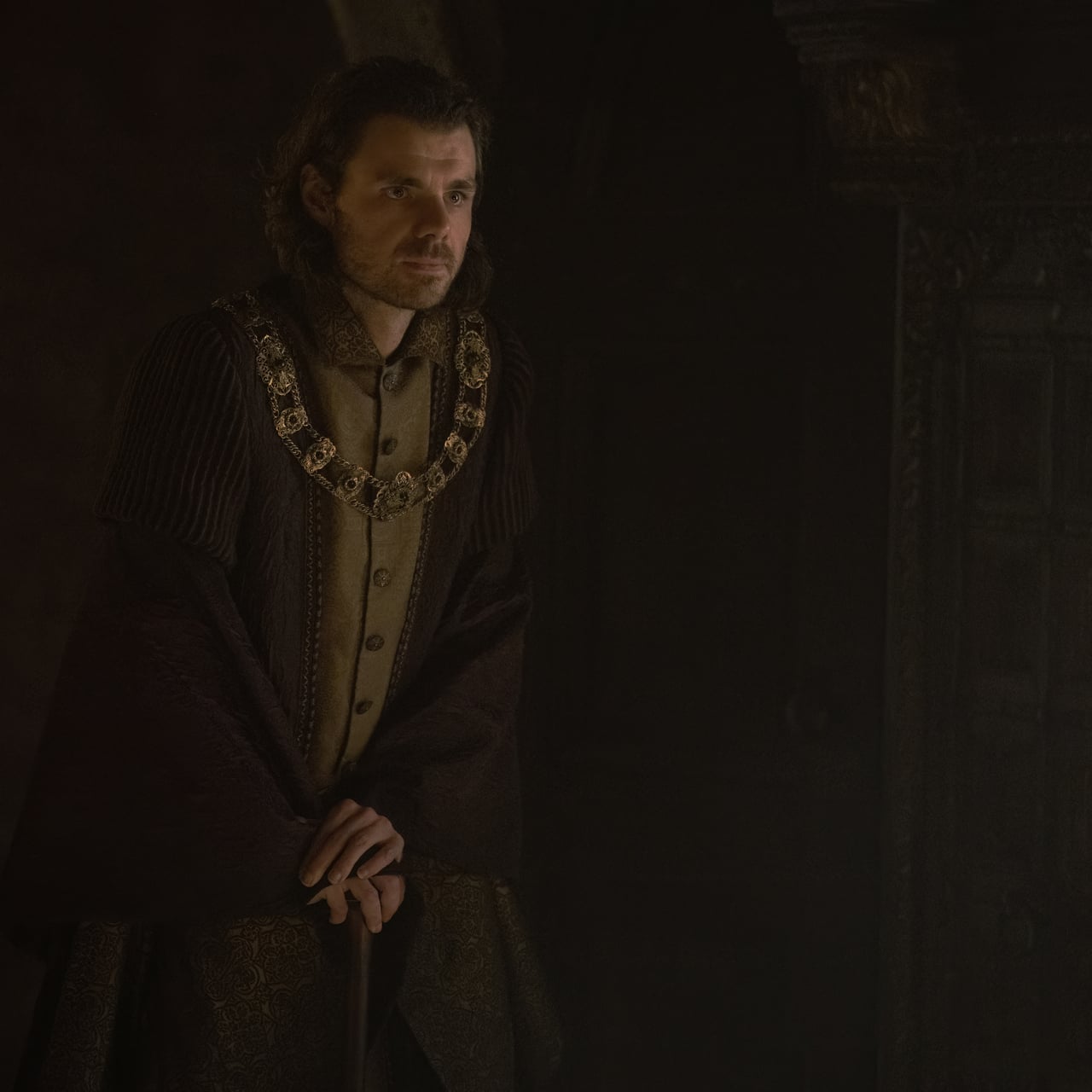 If you’re not caught up on the show, Larys is a second son of House Strong. He’s long been loyal to Queen Alicent, supplying her with information from his vast network of spies in the Red Keep and beyond. He’s cunning, but not physically strong or a warrior. Much attention has been given to Larys’s disability and use of a cane throughout the show. Notably, he ordered the deaths of both his father Lord Lyonel Strong (former Hand to King Viserys), and older brother Ser Harwin Strong (who was Princess Rhaenyra’s lover, and father to her three eldest children) after Queen Alicent vented her frustrations over shifting court alliances and Rhaenyra’s bastard children. Larys is a deceptive, mysterious, and, frankly, creepy character – with, it seems, a particular fascination towards Alicent.