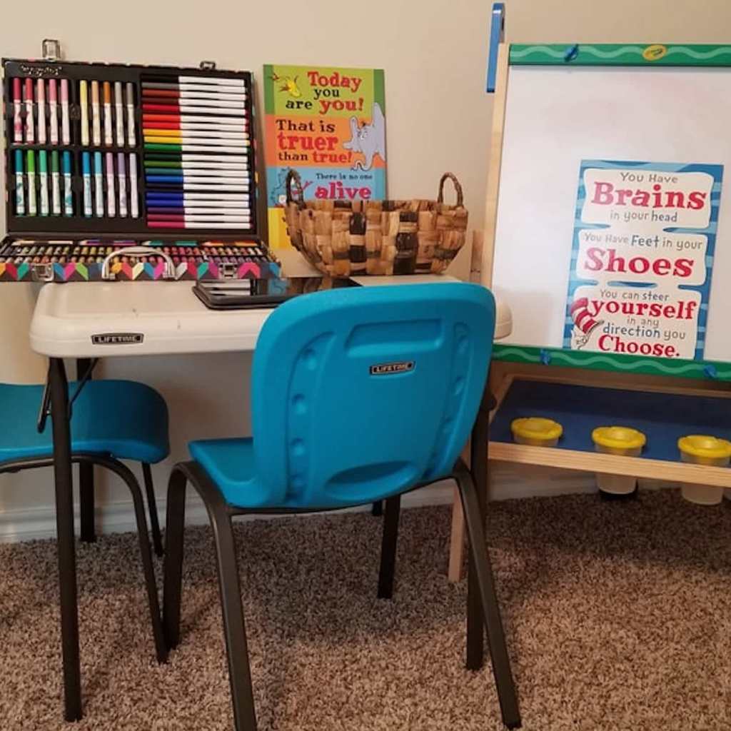 Decorate and help your kids to personalize their learning station. This will make the space more fun and more comfortable, and it gives the kids a sense of ownership in the space. My kids love Dr. Seuss, so we put up a few small inspirational Dr. Seuss posters.