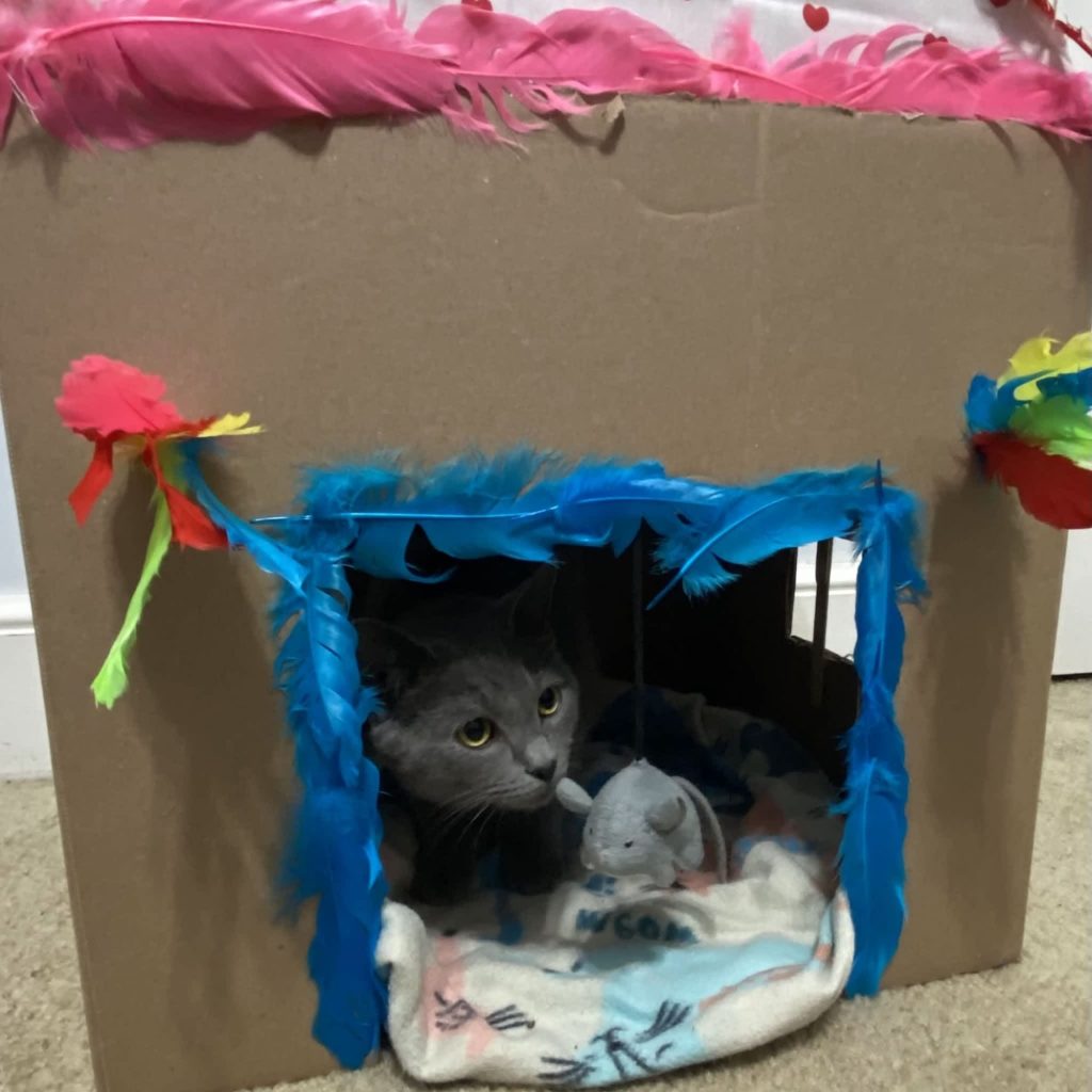 Once you’re done decorating, put a soft blanket or cat bed into the house so your cat has a cozy spot to curl up for a nap.