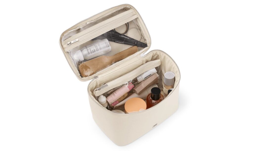 For the traveller who only wants to bring the bare beauty and toiletry essentials, there’s the Open Toiletry Bag ($95). Available in colours light brown, cream, black and grape, the case comes with a removable wet pouch where you can store items that are in danger of leaking, like toothpaste, serums or lotions. The pouch also has internal zipped pockets for easy access to your toiletries, as well as side elastics to hold smaller items like tweezers, brow brushes and lip balms in place.