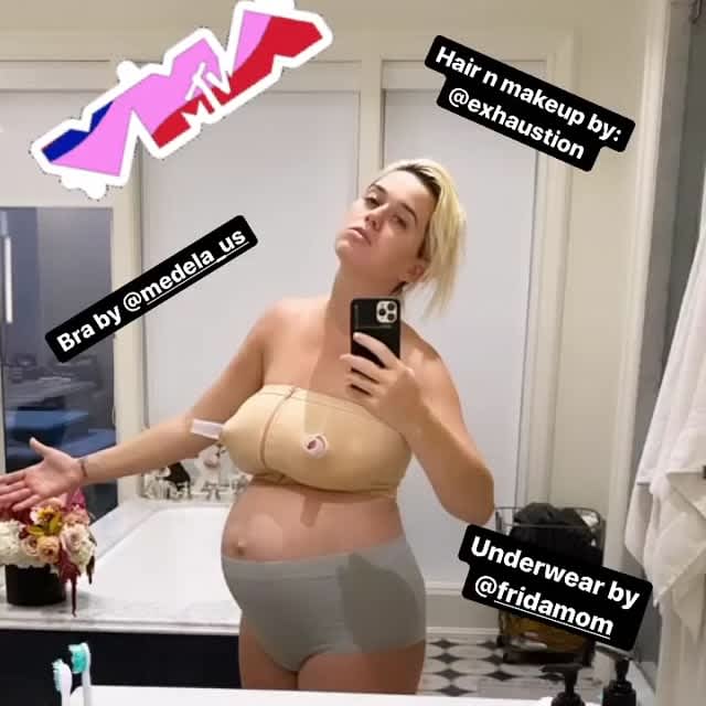 During Sunday’s virtual MTV VMAs, the new mom posted a mirror selfie to her Instagram Stories that put her postpartum body on full display, complete with maternity underwear by Frida Mom and – in true “stars really are just like us” fashion – a breast-pumping bra by good ol’ Medela.