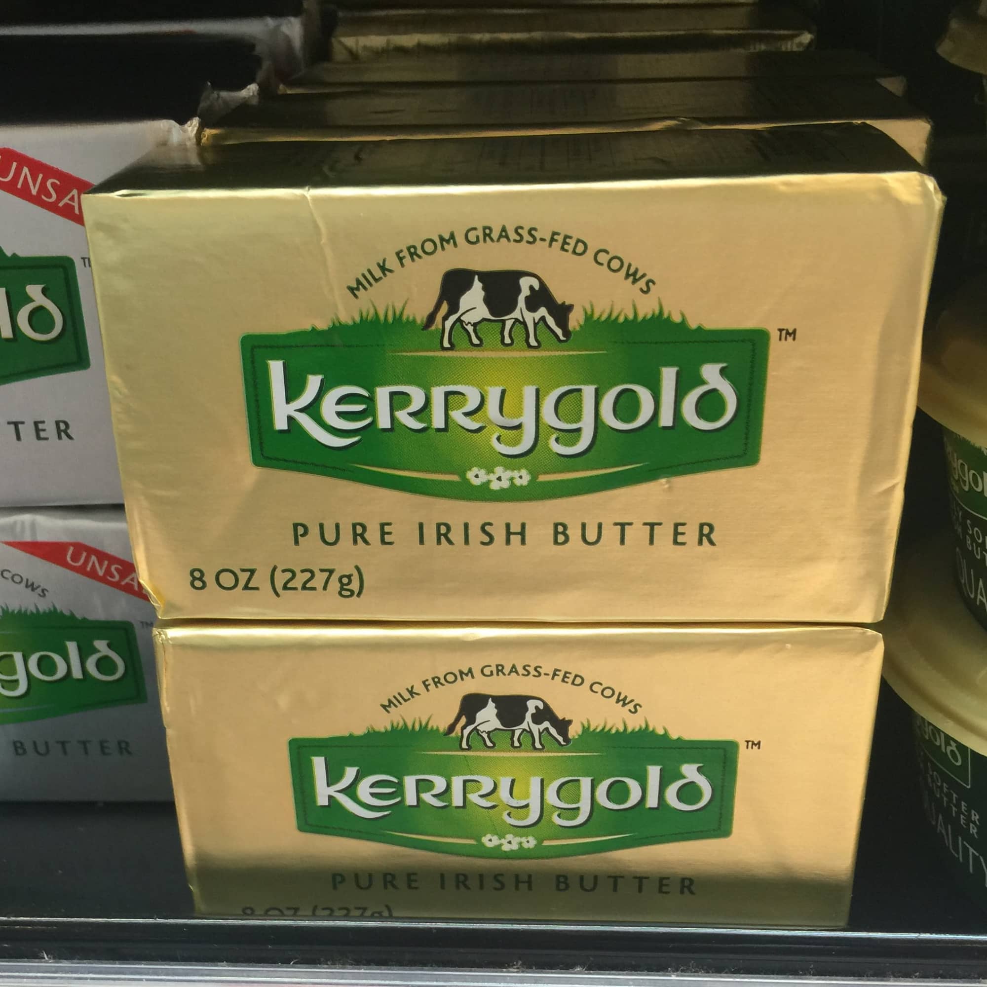 Let’s begin with its appearance: compare Kerrygold (pictured on the top) to conventional American butter (shown on the bottom). Kerrygold has a deep straw color, rather than the pale, chalky color of standard butter. And no, Kerrygold butter isn’t dyed with artificial colors to amp up its golden hue; the dairy cows graze on Ireland’s emerald-green grass 10 months out of the year, and the beta-carotene in the fresh grass contributes to the rich color. In contrast, most conventional dairy cows in America don’t have the luxury of grazing freely on green pastures and are fed a diet that consists of corn and soybeans.
