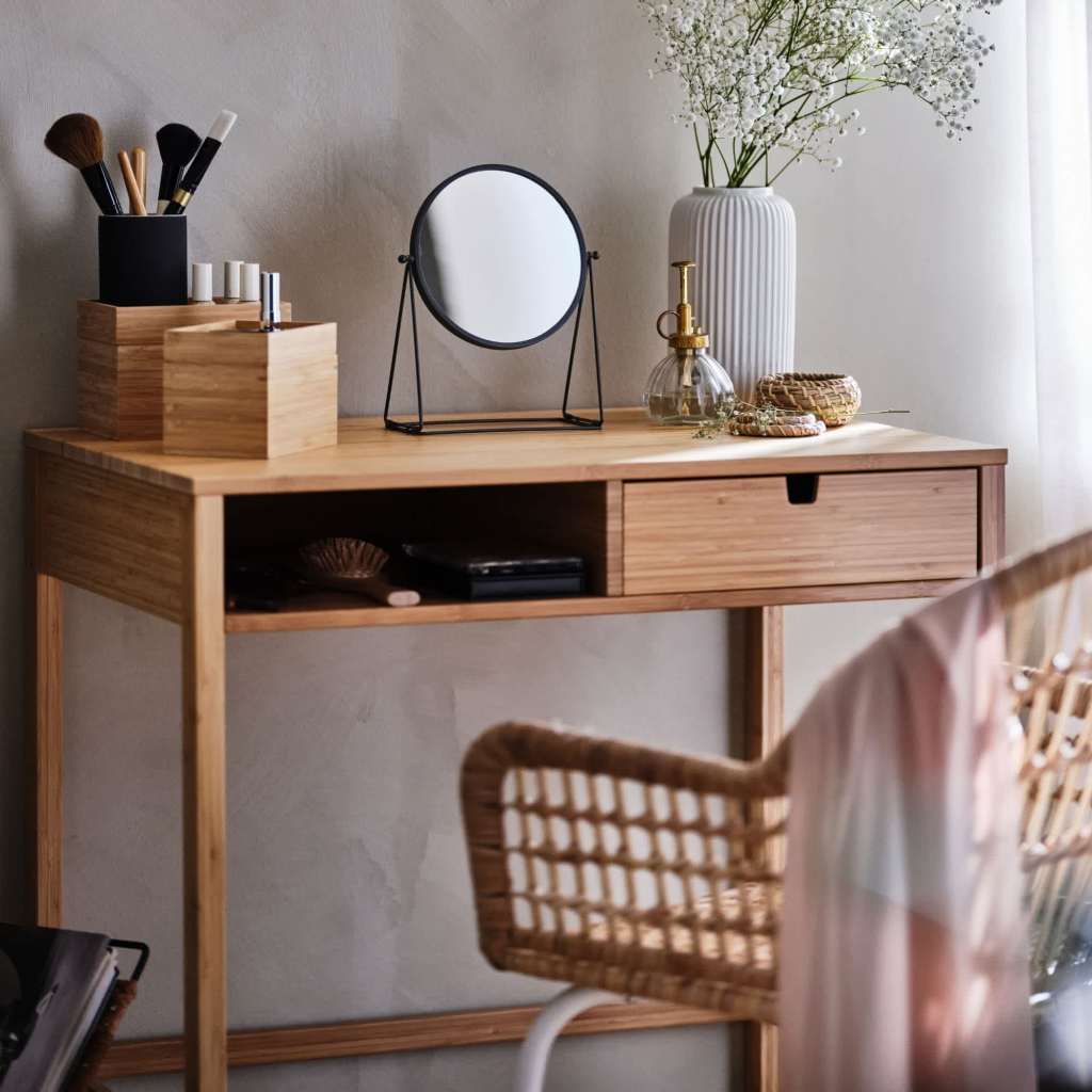 “For a permanent dressing table solution, a wall-mounted round mirror helps to soften any straight lines in the room and it gives you more workspace on the table. Or if you need more flexibility in a smaller space, you can use a table mirror built-in lights such as the KAITUM ($49) and place it where you need it.”