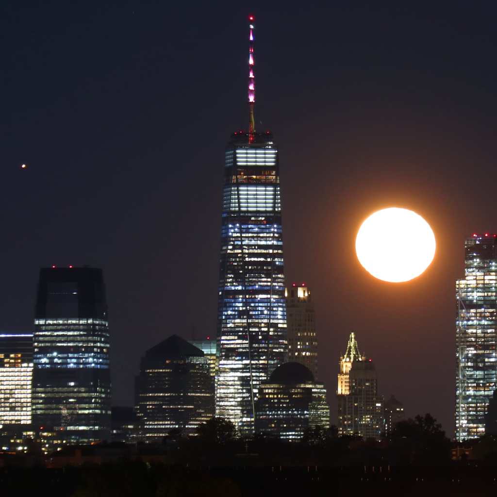 Mars to the left of the moon in the New York City sky on Oct. 1, 2020.